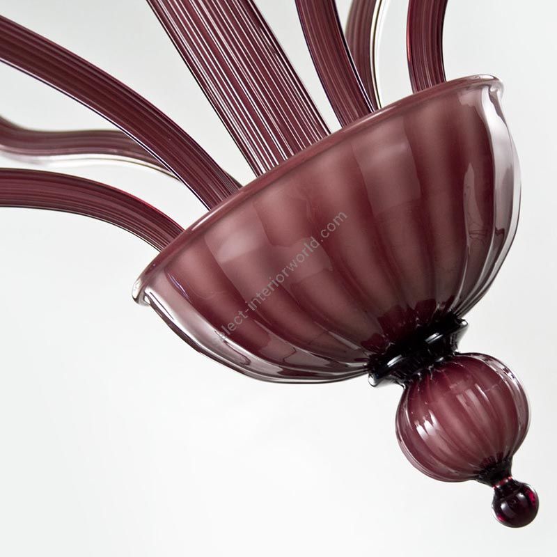 The blown glass Velvet venetian chandelier is inspired from the Art Deco style. It is characterized by long arms which are bended upwards and by encased coloured glass, which confers a peculiar texture to the material.