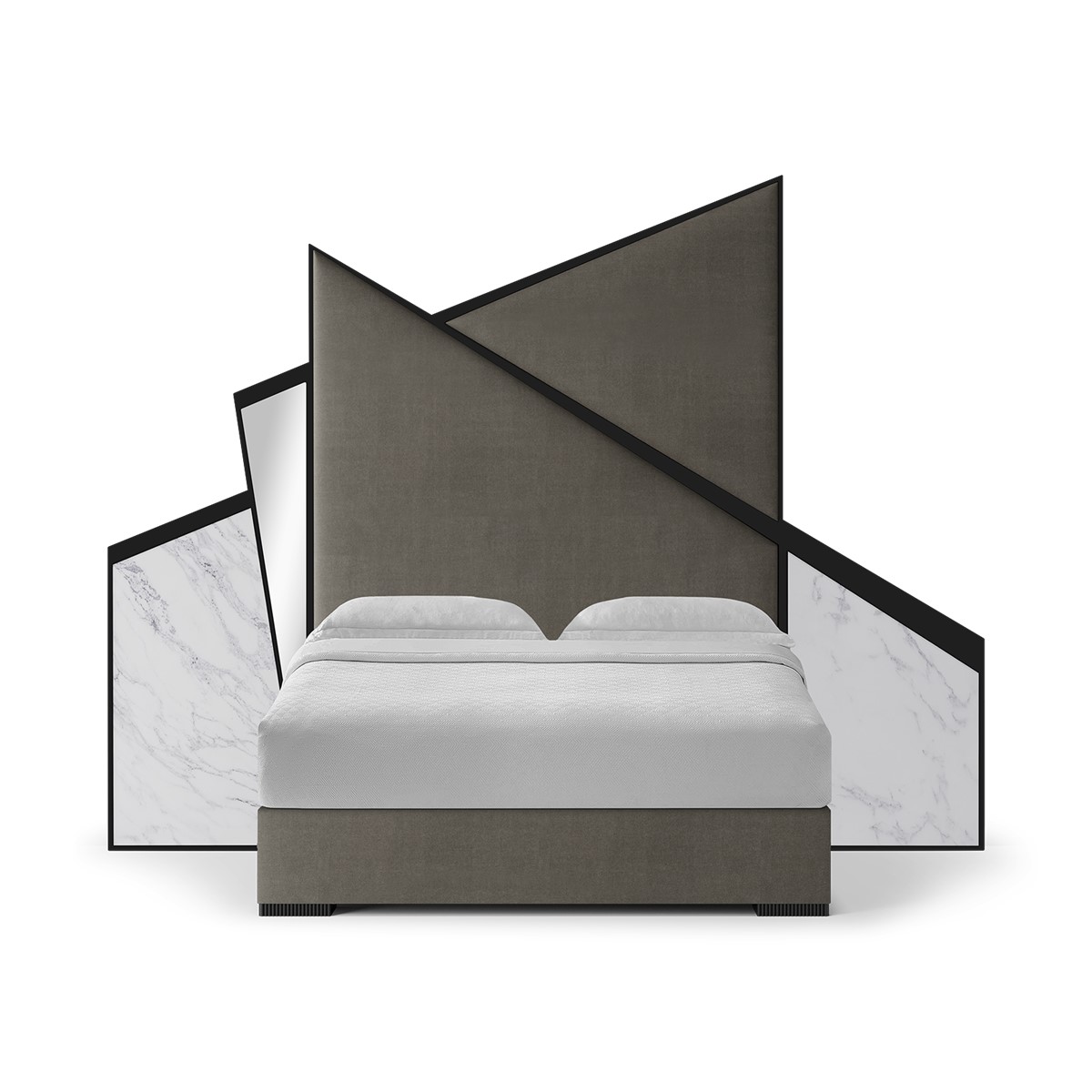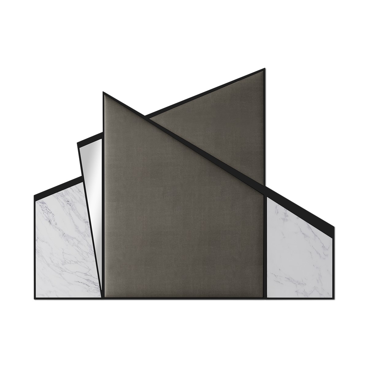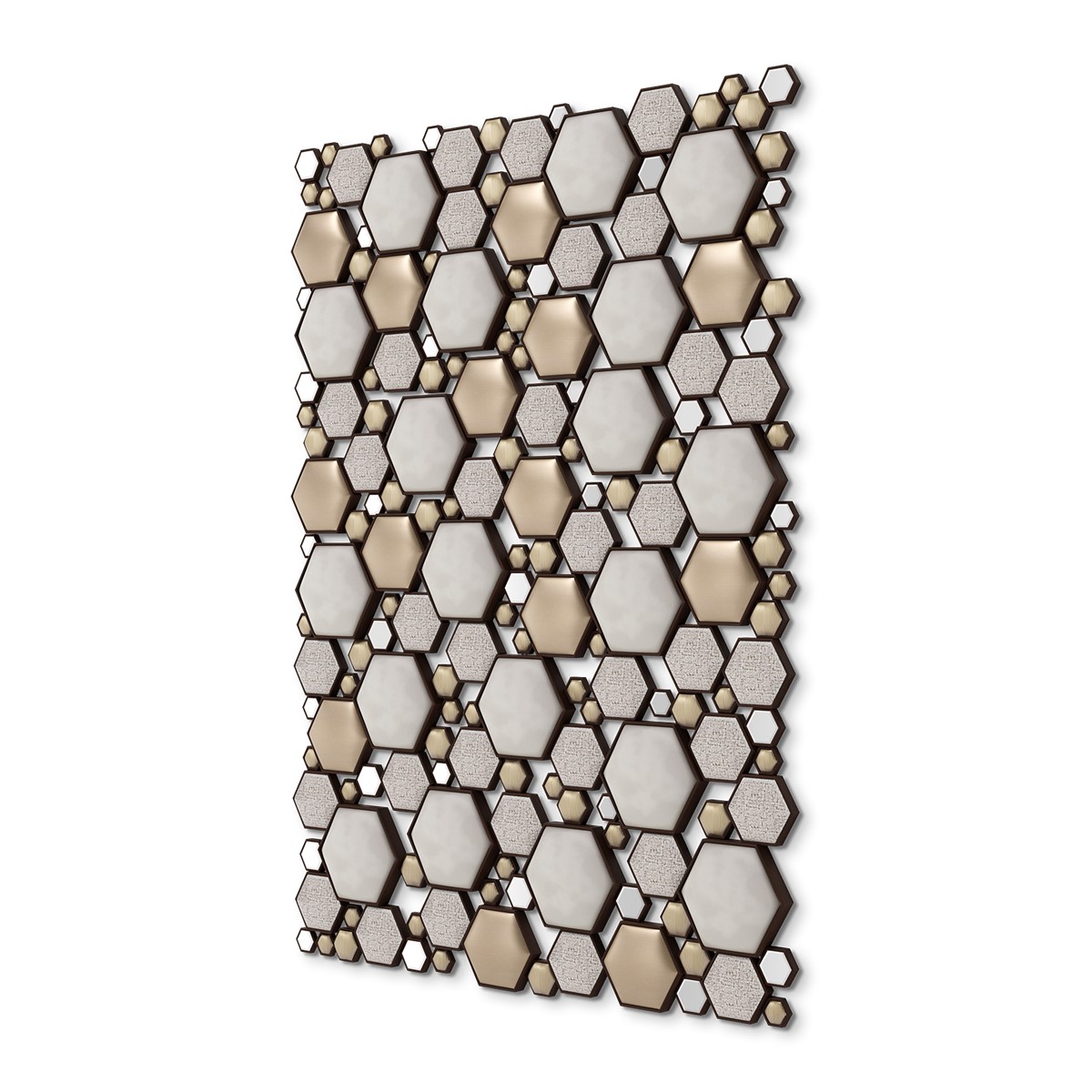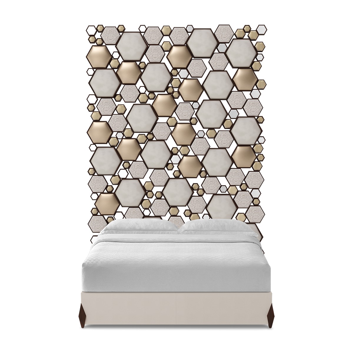 Inspired by the French-Hungarian artist credited as the grandfather and leader of the Op Art movement, Vasarely is an exquisite and mesmerising rectangular headboard formed of myriad upholstered and mirrored hexagons of various sizes, each in its own hand carved wood frame. Made to fit any standard size of bed. Simply spectacular!