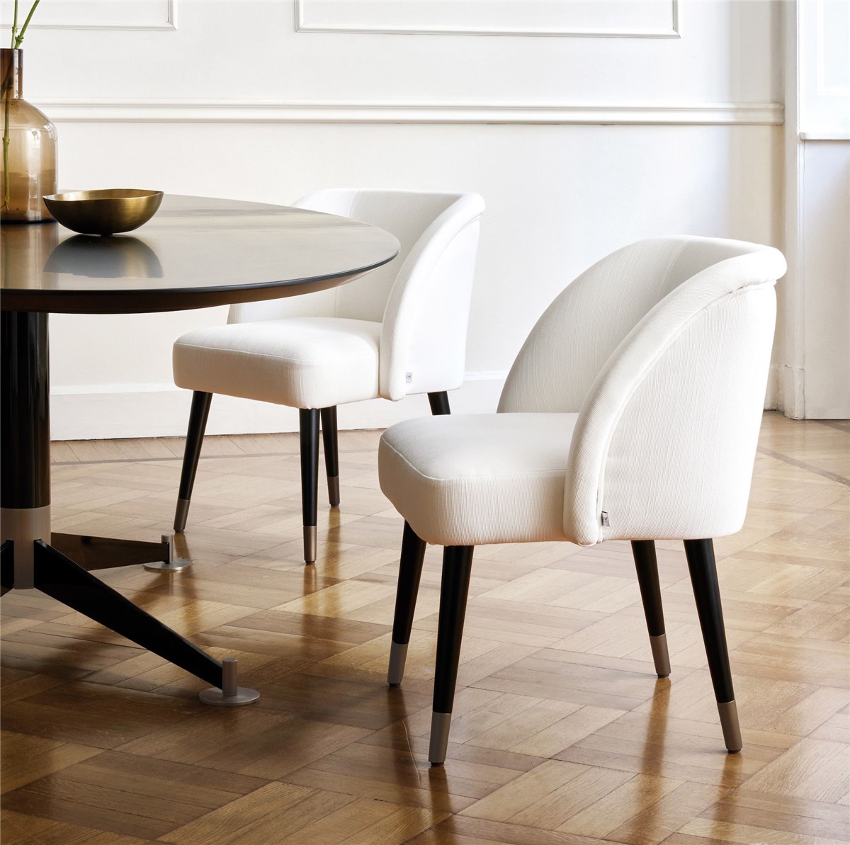 Our Bernadette dinner chair has a delicate imprint of the Seventies. Comfortable and relaxed in the seat, it fascinates with the refined shape of the legs, whose lacquered wood culminates in a metal tip: a seductive and confident detail like an accomplice smile. The Bernadette Dinner chair is part of a family that also includes the dinner bench, the barstool, the armchair, the small sofa and the pouf. Due to the attention to tailor-made details and her noble personality, Bernadette embodies the DOM Edizioni philosophy at its best.