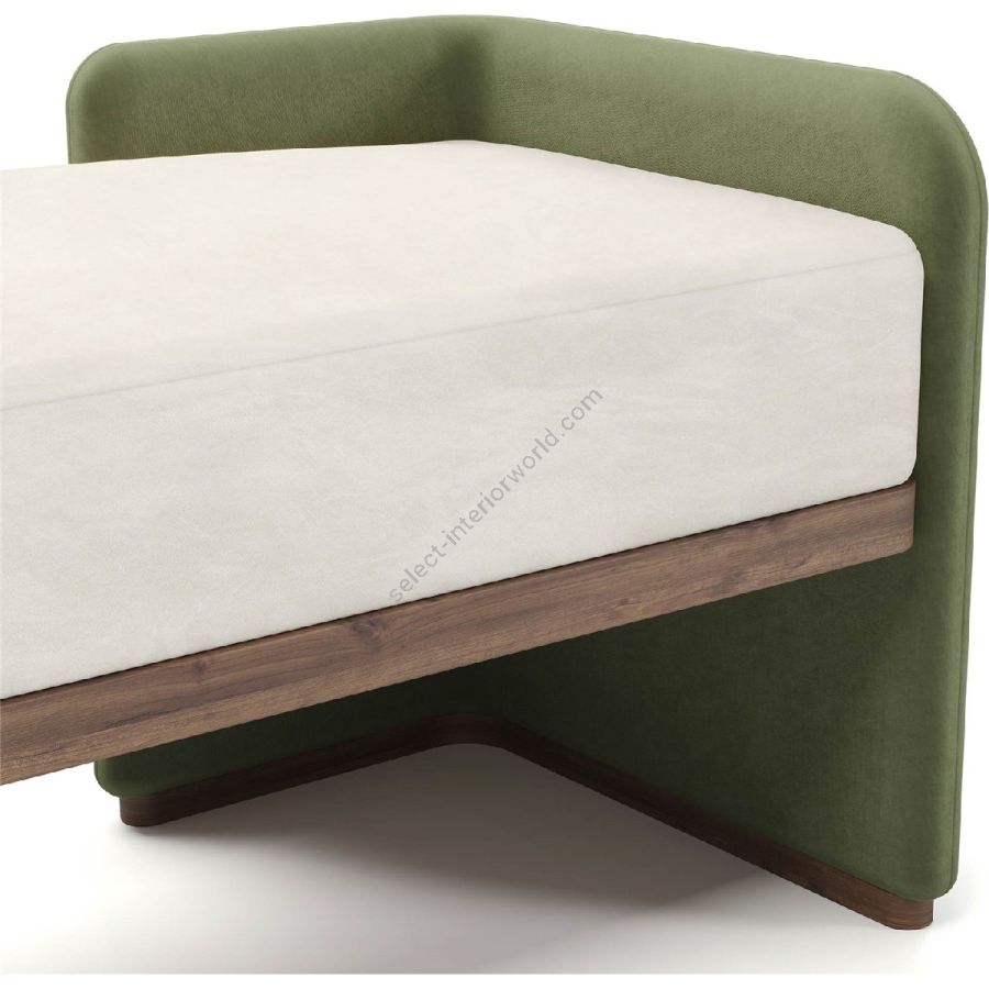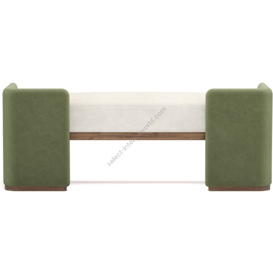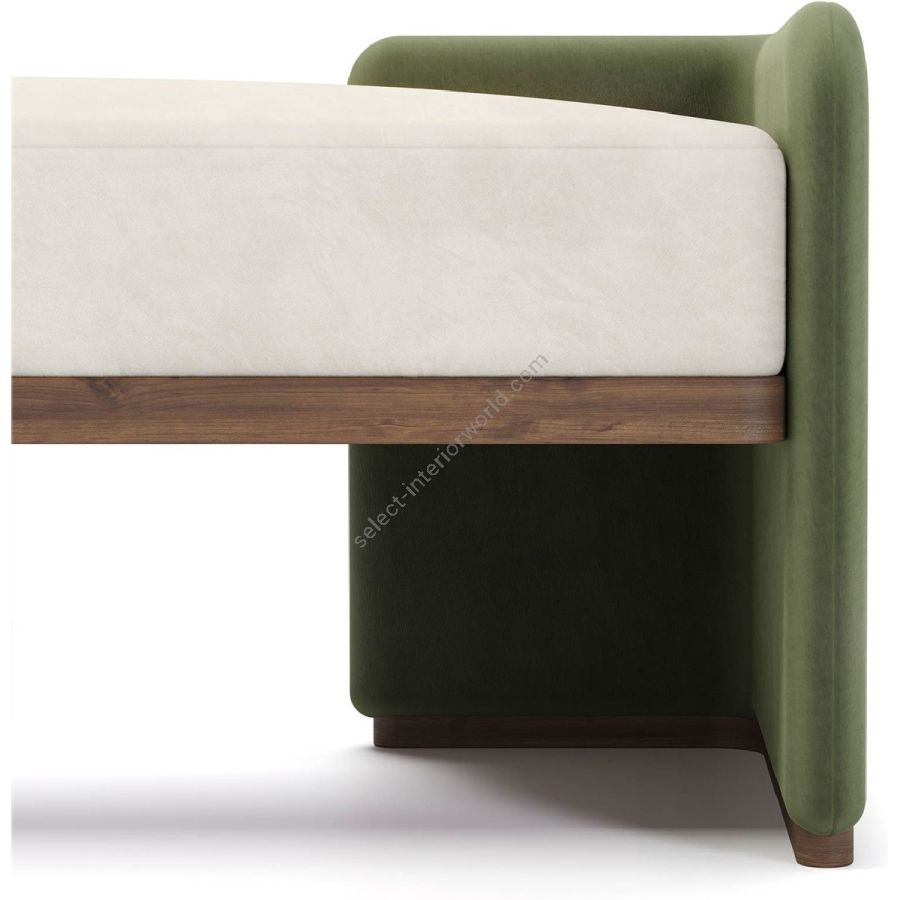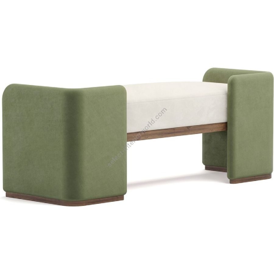 The Hinga Bench features a plush, ivory upholstered seat that offers both comfort and elegance. The seat is perfectly complemented by a rich, green fabric wrapping the sturdy, curved ends, providing a striking contrast and a touch of vibrancy. The bench’s structure is highlighted by a solid walnut base that adds warmth and a natural element to its contemporary design.