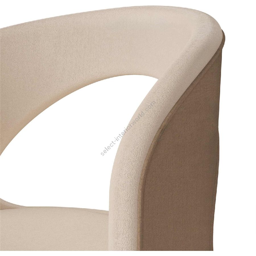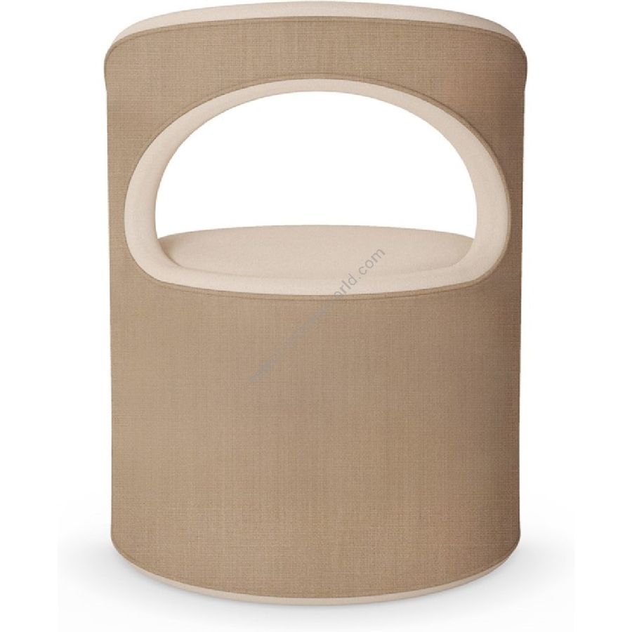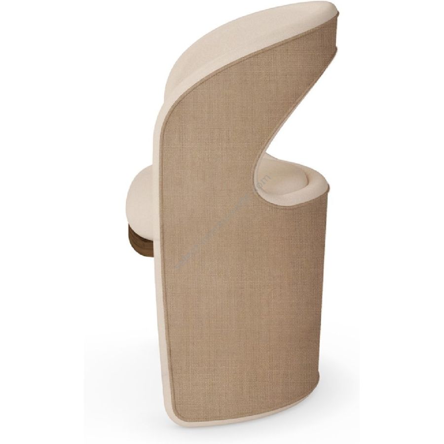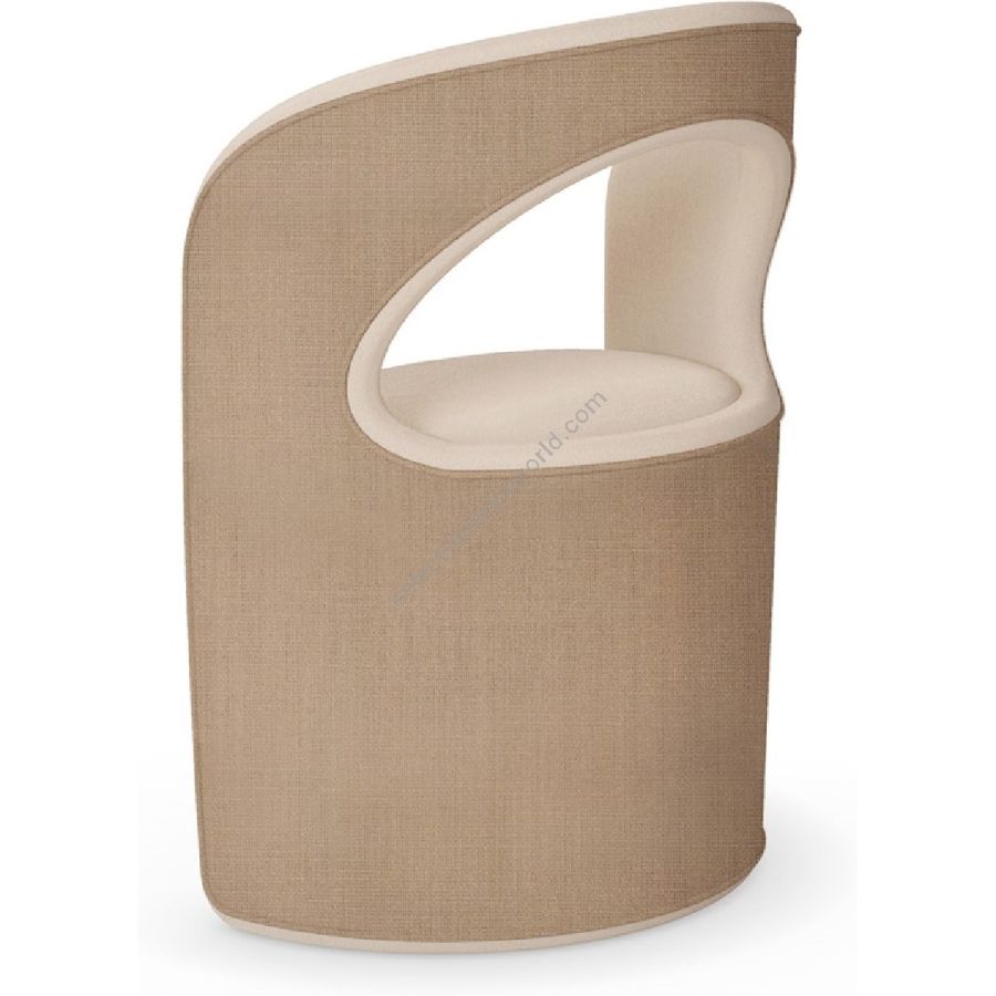 The chair is upholstered in a refined linen fabric, providing a natural texture that enhances its contemporary design. The soft, neutral hue of the fabric ensures versatility, making it an ideal addition to various interior styles. The chair features a smooth, curved backrest that provides excellent support and comfort, while the open-back design adds a touch of elegance and lightness.