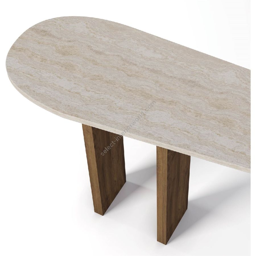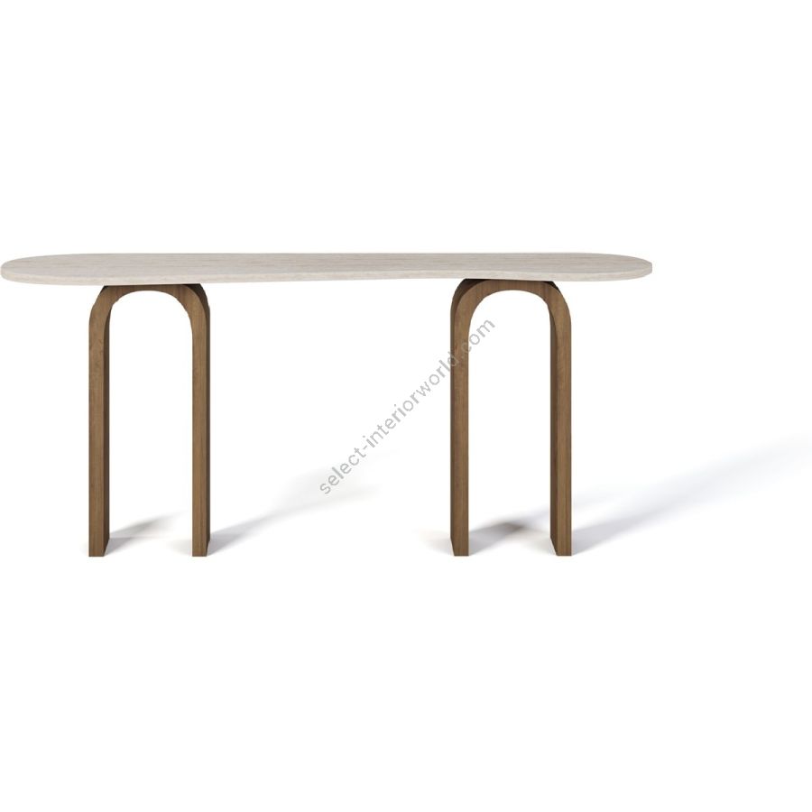 Oona Console, where contemporary design meets natural elegance. The console features a sophisticated travertine top, offering timeless beauty and a refined look. Supported by a distinctive U-shaped leg in matte walnut, the Oona Console combines sleek lines with warm, organic materials. Perfect for adding a touch of modern sophistication to any hallway, entryway, or living space, the Oona Console is both a functional piece and a stylish statement.