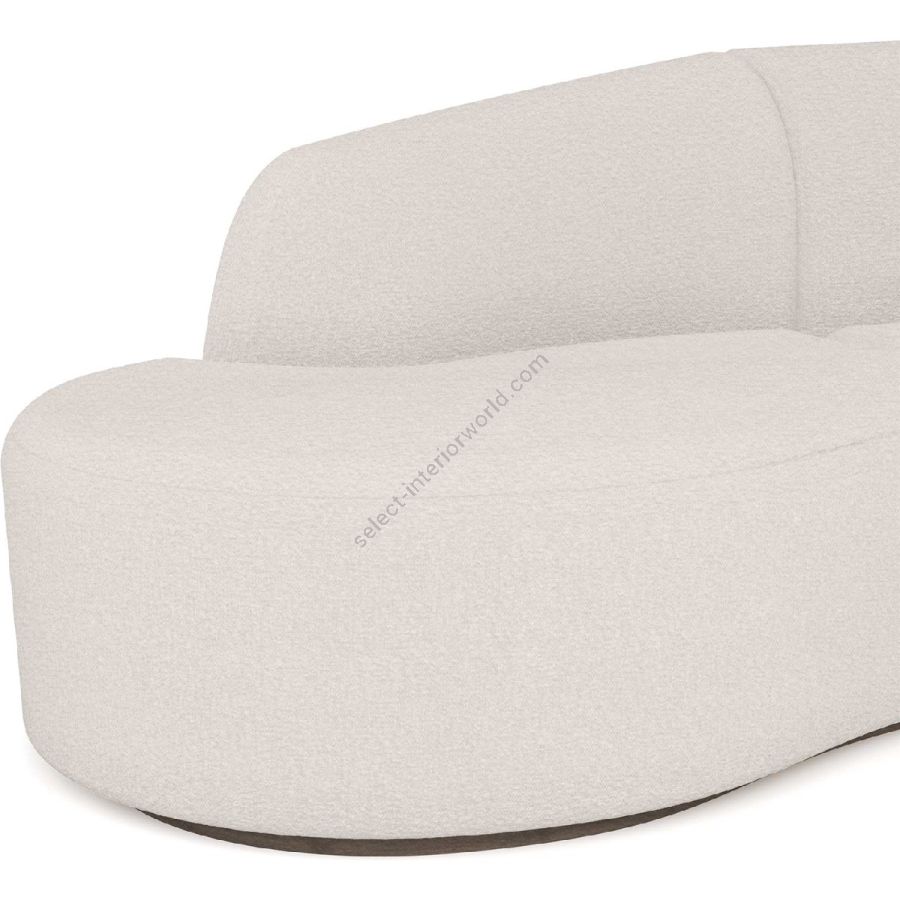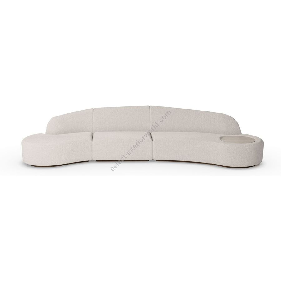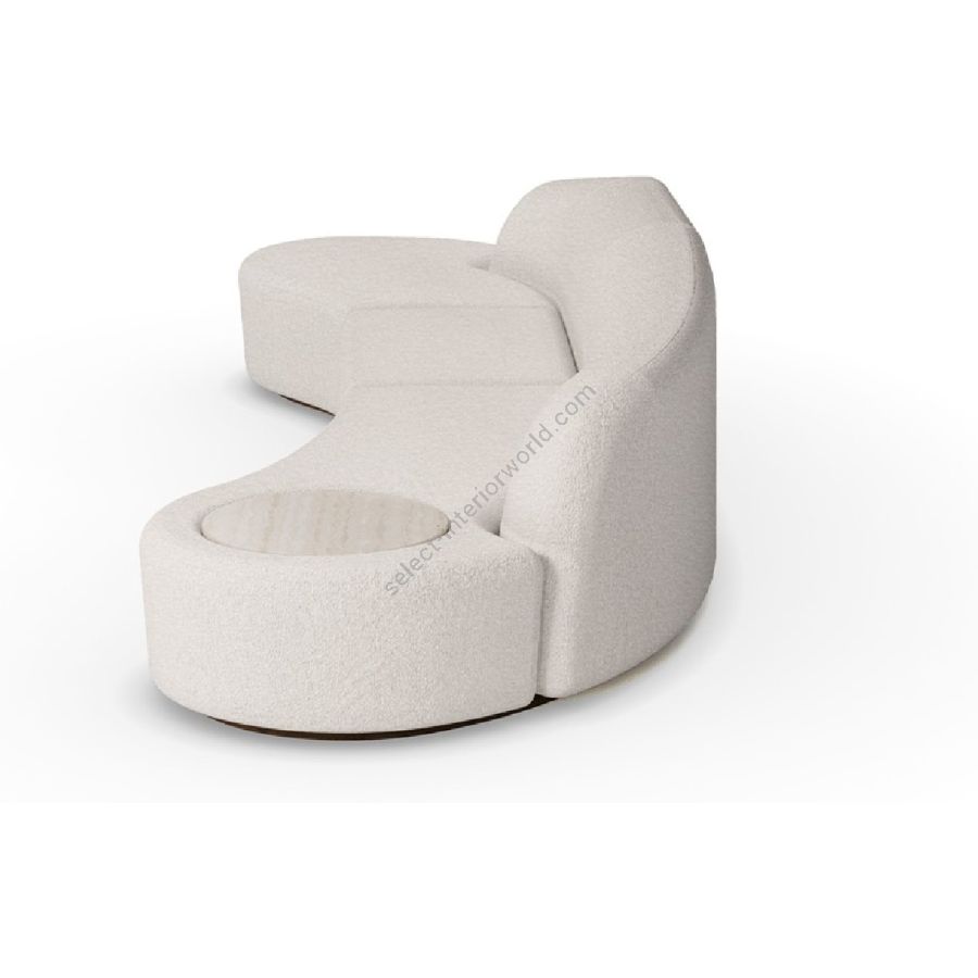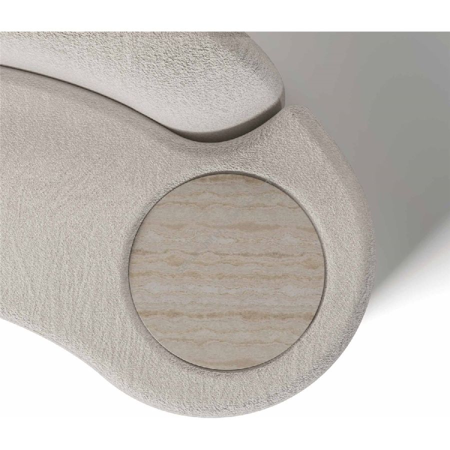 Nolita Harbour Nathalie II Sectional Sofa, an evolution of modern comfort and multifunctional design. This elegantly crafted sectional features plush, curved forms upholstered in luxurious boucle fabric, ensuring an exceptionally cozy seating experience. The distinctive feature of the Nathalie II is its integrated circular travertine top, functioning as a convenient side table, seamlessly blending style and functionality.
