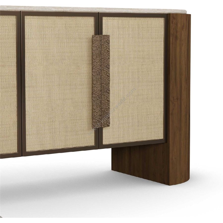 The Capucine Sideboard from Nolita Harbour is a masterful blend of natural materials and refined elegance. This statement piece is crafted from rich walnut, showcasing the beauty of its wood grain, and is paired with a smooth travertine top that adds a luxurious touch to the design. The cabinet doors are beautifully wrapped in synthetic wicker, introducing a tactile contrast and earthy texture. Enhancing its sophisticated appeal, hammered aged brass accents adorn the handles, providing a vintage-inspired charm. Ideal for dining or living spaces, the Capucine Sideboard offers both aesthetic allure and practical storage, making it a perfect addition to any modern or classic interior.