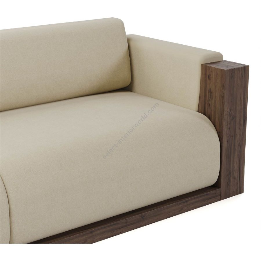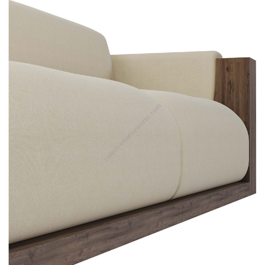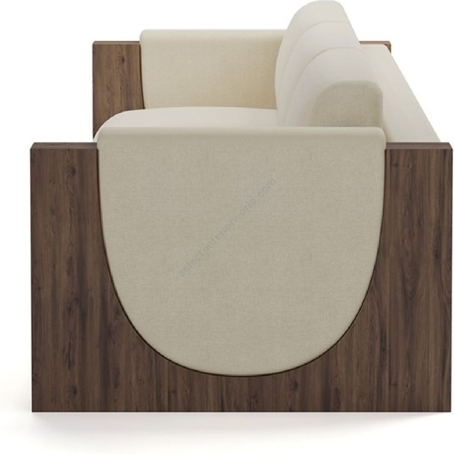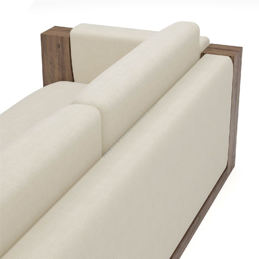 The sofa is framed by beautifully crafted walnut panels, adding a rich, natural element to its design. The walnut side panels and base provide a sturdy structure and a touch of elegance, enhancing the overall visual appeal.