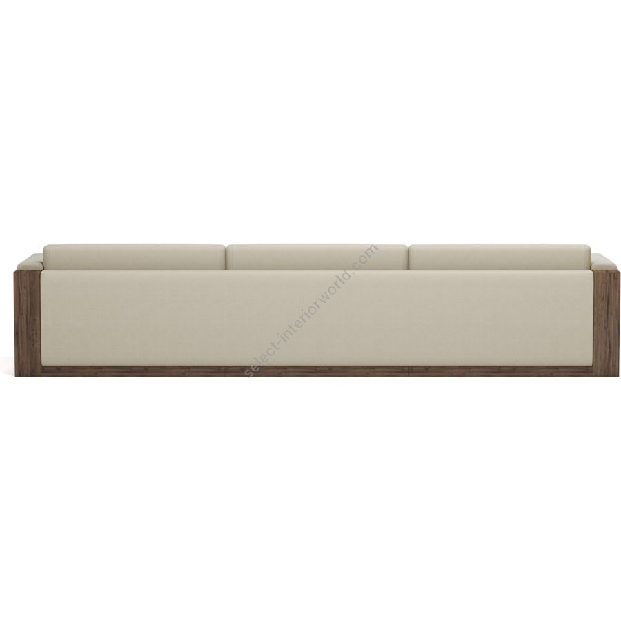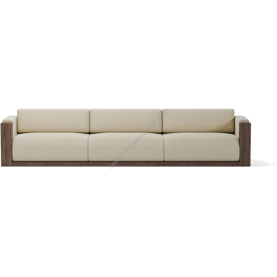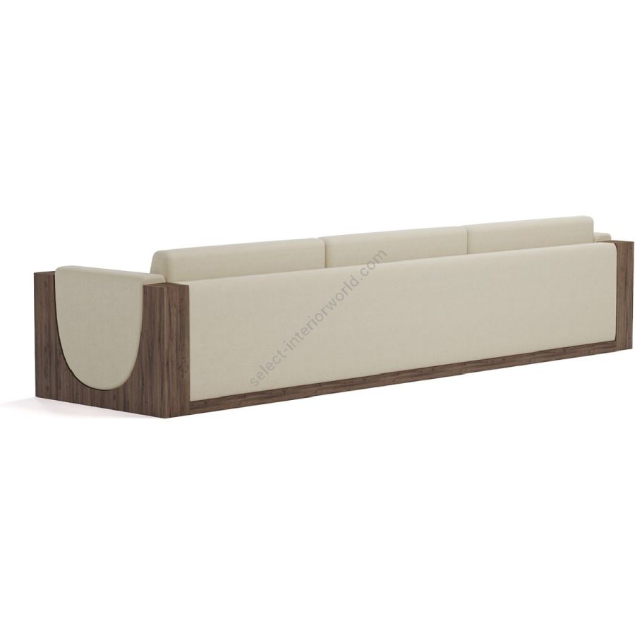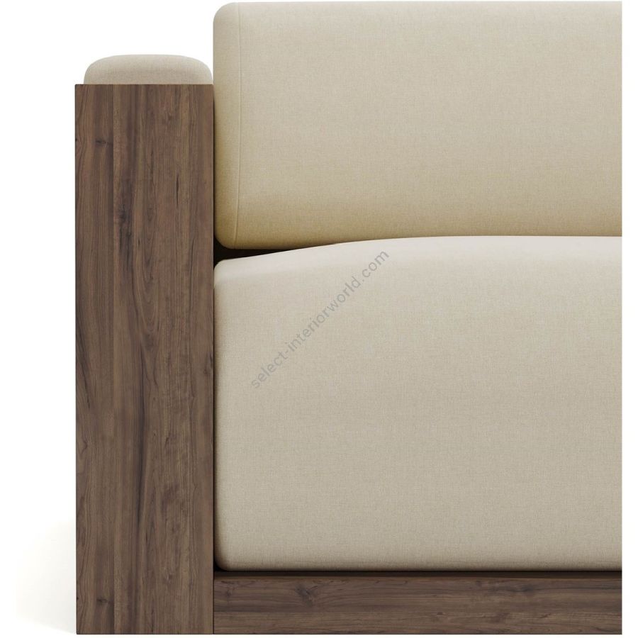 The sofa is framed by beautifully crafted walnut panels, adding a rich, natural element to its design. The walnut side panels and base provide a sturdy structure and a touch of elegance, enhancing the overall visual appeal.