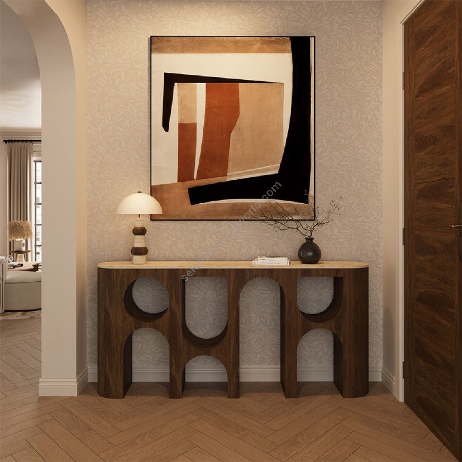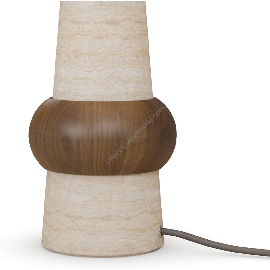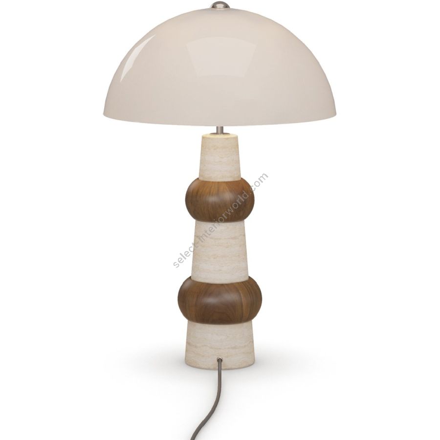 The Claus table lamp is a masterful blend of organic materials and contemporary design, offering a sculptural presence with refined elegance. Its tiered base, crafted from travertine and walnut, showcases a harmonious interplay of textures—smooth stone meeting the warmth of rich wood. The softly rounded walnut elements add depth and contrast, enhancing the lamp’s artistic form. Topped with a lacquered dome shade, it provides a gentle, diffused glow, perfect for creating a warm and inviting atmosphere. A striking addition to bedside tables, consoles, or reading nooks, the Claus lamp effortlessly balances sophistication and modern craftsmanship.
