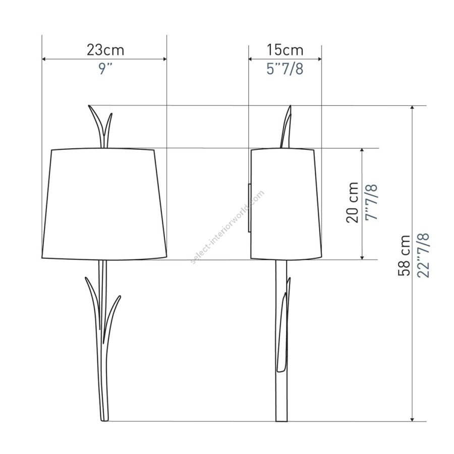 Width: 23 cm, Projection: 15 cm, Maximum: 2 x 40 w, Les Abat-jours peuvent être fabriqués dans 18 coloris au choix, The colour for the shades can be chosen out to 18 different hues