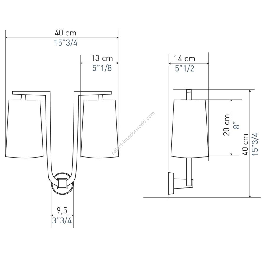 Width: 40 cm, Projection: 14 cm, Maximum: 2 x 40 w, Les Abat-jours peuvent être fabriqués dans 18 coloris au choix, The colour for the shades can be chosen out to 18 different hues