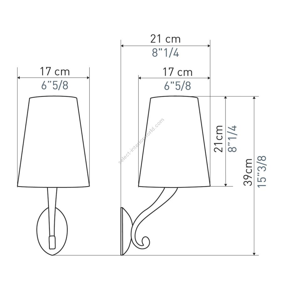 Width: 17 cm, Projection: 21 cm, Maximum: 100 w, Les Abat-jours peuvent être fabriqués dans 18 coloris au choix, The colour for the shades can be chosen out to 18 different hues