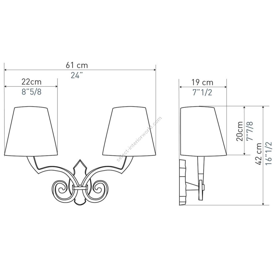 Width: 61 cm, Projection: 19 cm, Maximum: 2 x 100 w, Les Abat-jours peuvent être fabriqués dans 18 coloris au choix, The colour for the shades can be chosen out to 18 different hues