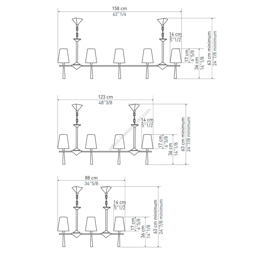 Height: 63 cm minimum, Width: 158 cm, Maximum: 5 x 40 w