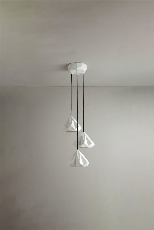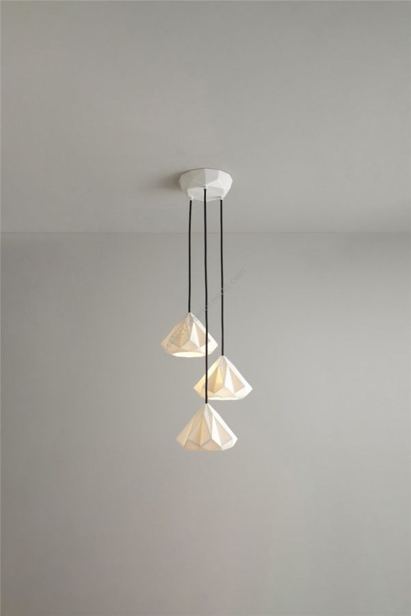The Hatton 1 Grouping of Three Pendant is a truly iconic statement piece. Using a highly skilled process, we have been able to transform the bone china shade into an intricate, multi-faceted, gem-like form. When switched 'off' the pendant has an angular sculptural beauty, and when 'on' it provides warm illumination with dramatic lines and shadows.
