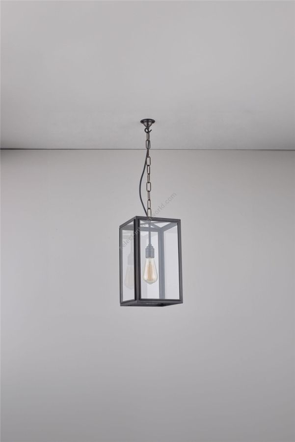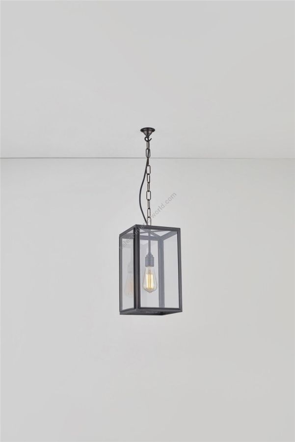 Square Pendant in weathered brass, externally glazed and available in three sizes. Suspended on a weathered brass hook 1.5 meters of chain. Glass on four sides, with open top and base. Suitable for interior use only.