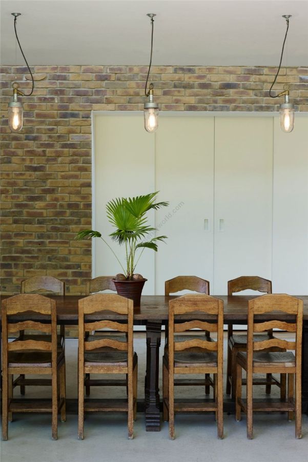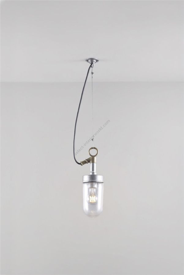 A simple iron pendant with screw type well glass. Galvanised finish with brass suspension loop and cable entry. Suspended using stainless steel wire from a ceiling hook plate.