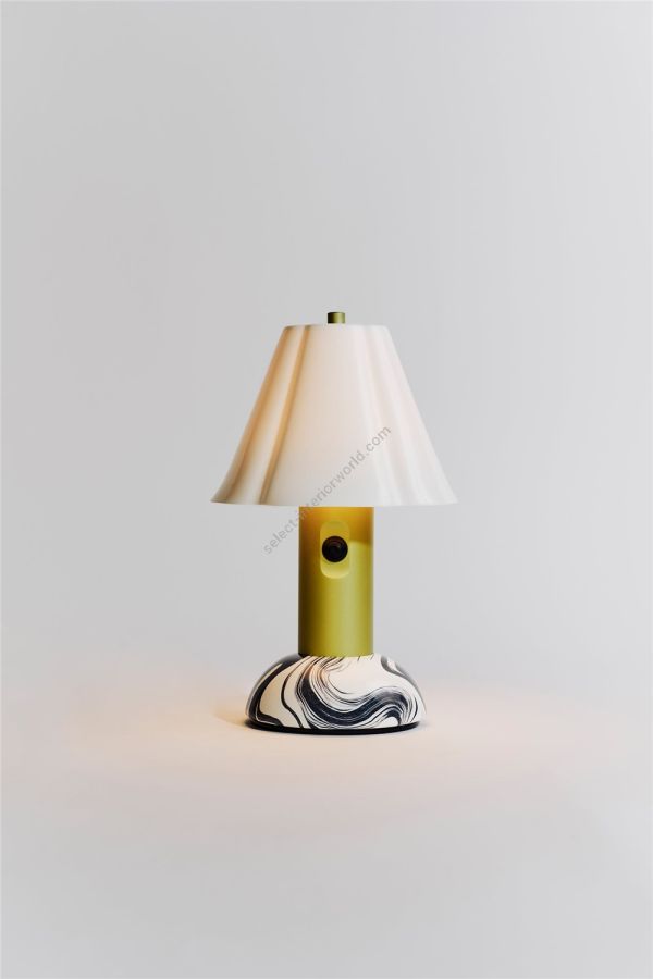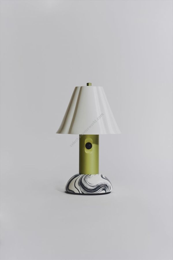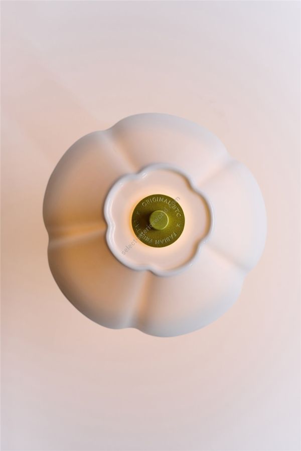 Combining maximalist aesthetics with intriguing contrasts, the Blossom FF Edition brings out a vibrant side of our beloved Blossom portable light. Designed by German designer Fabian Freytag, it showcases a striking monochrome, marble-like hydro-dipped base, highlighted by an iridescent green stem and our signature fluted bone-china shade. It's topped off with a metal disc in matching green spelling out Original BTC x Fabian Freytag – a special detail of Blossom FF.