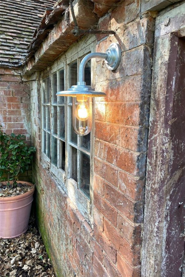 An Exterior Bracket Light (with reflector) with right angle arm and round base is a traditional marine inspired fixture. Skillfully cast at our Birmingham metalworks and rated IP54, this is the perfect outdoor wall light. Available in galvanised or black. Galvanised guard sold separately. N.B. This product is galvanised underneath so the paint finish will not be completely smooth.