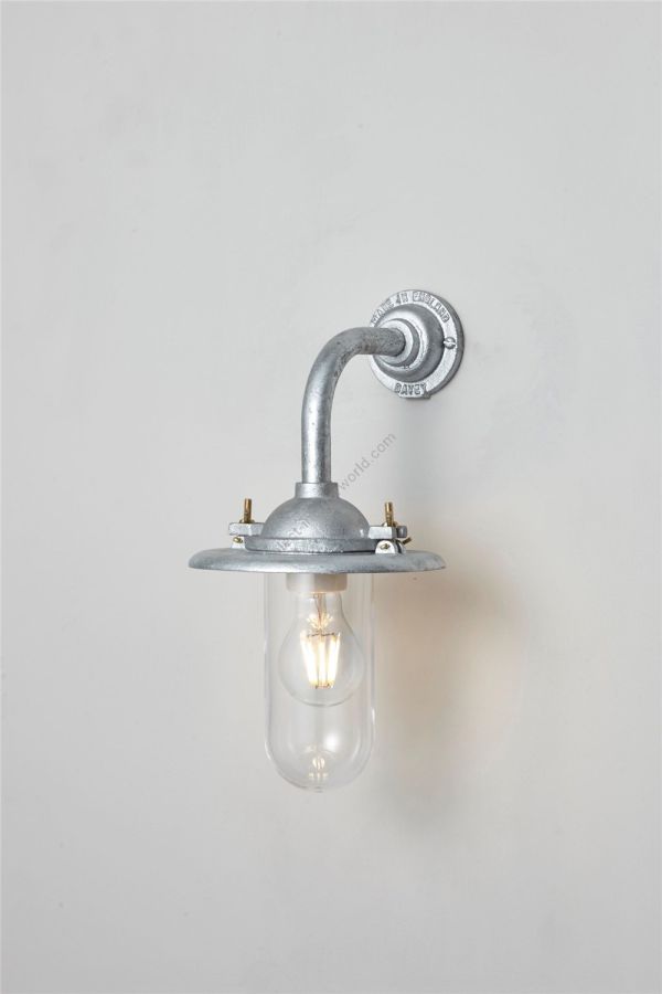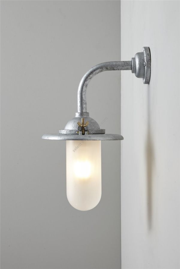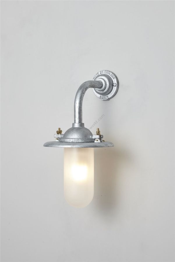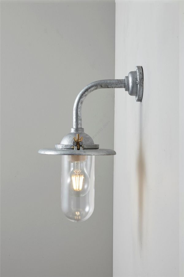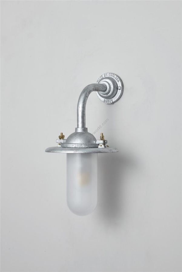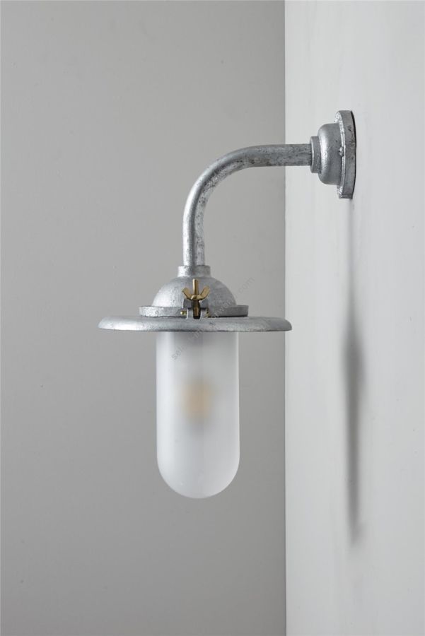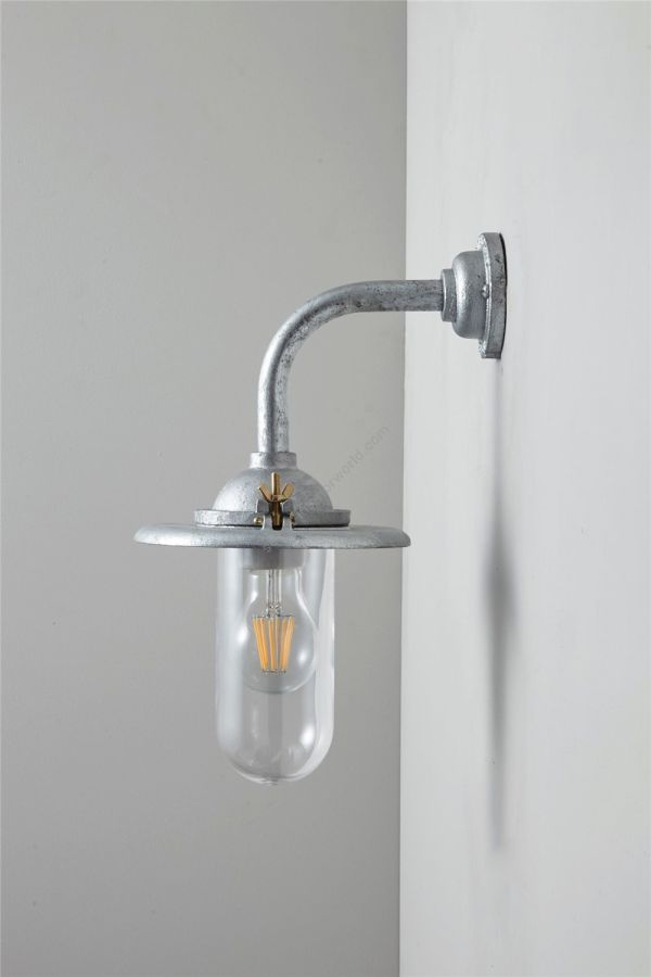 An Exterior Bracket Light with a heavy cast reflector that's held by brass wing nuts and bolts for easier access to the lamp. This industrial wall light is available in either galvanised cast iron or sandblasted bronze, with a canted or right angle arm. Glass is clear or frosted.