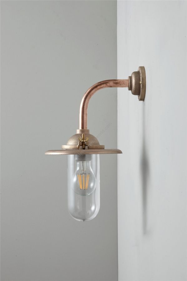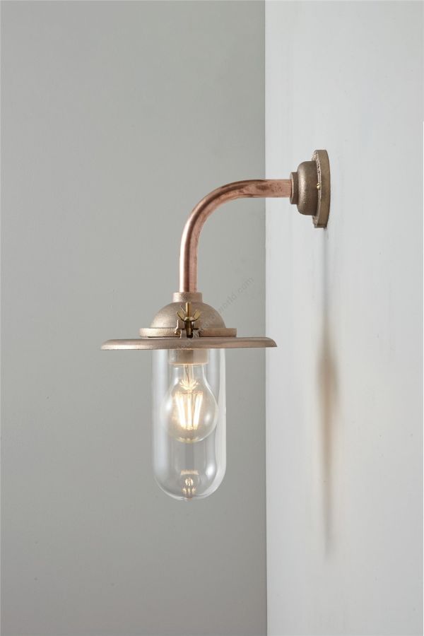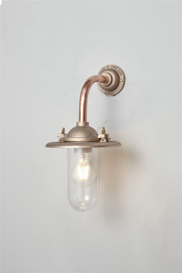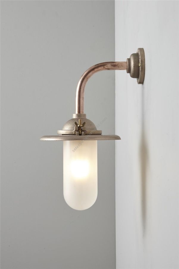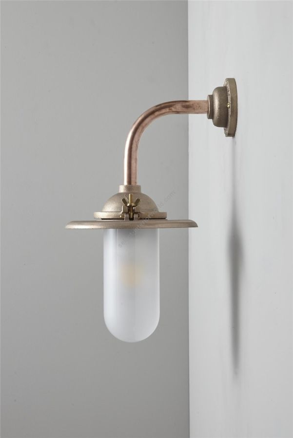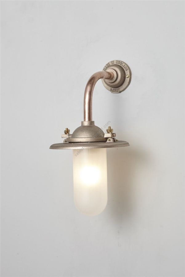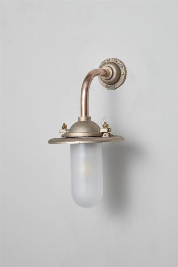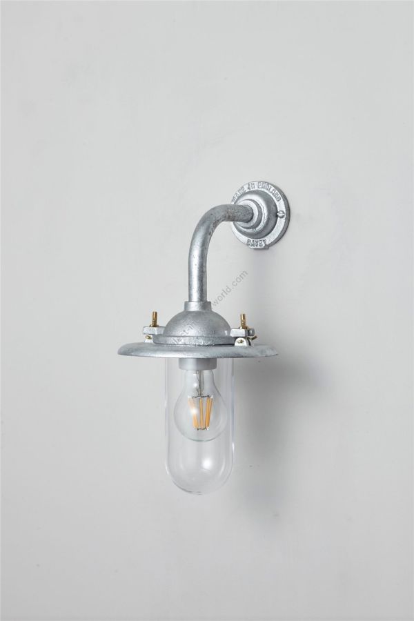 An Exterior Bracket Light with a heavy cast reflector that's held by brass wing nuts and bolts for easier access to the lamp. This industrial wall light is available in either galvanised cast iron or sandblasted bronze, with a canted or right angle arm. Glass is clear or frosted.