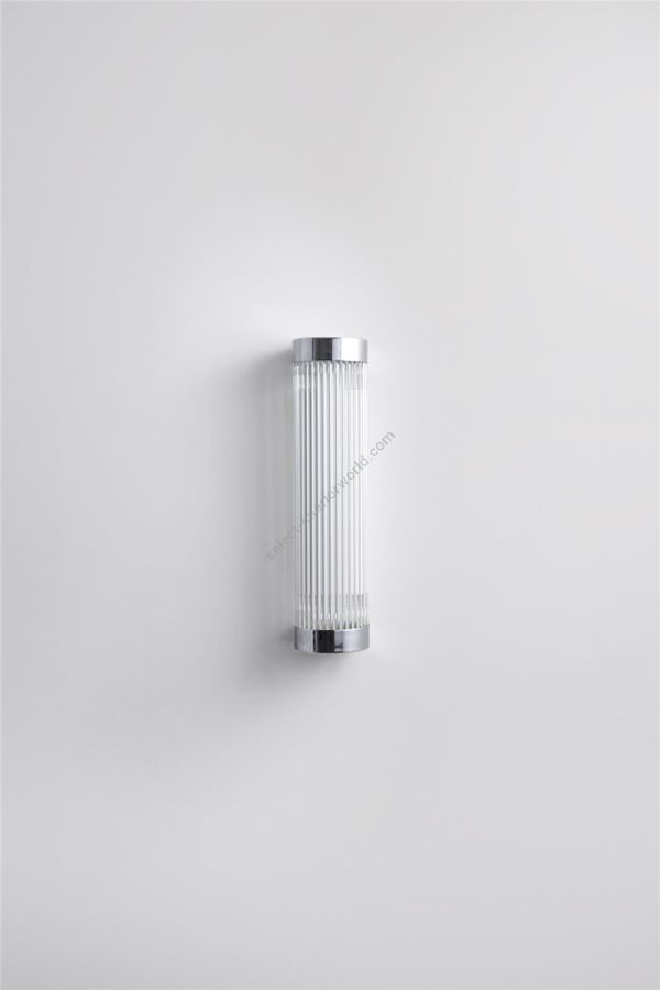 This is the LED version of the 7211 Narrow Pillar Wall Light, with an integral dimmable driver. The light's curved Art Deco-inspired profile is made of 8mm diameter solid glass rods. Available in weathered brass, polished brass or chrome plated finishes and in two different sizes (H:40cm x W:10cm or H:60cm x W:10cm).