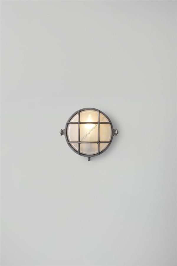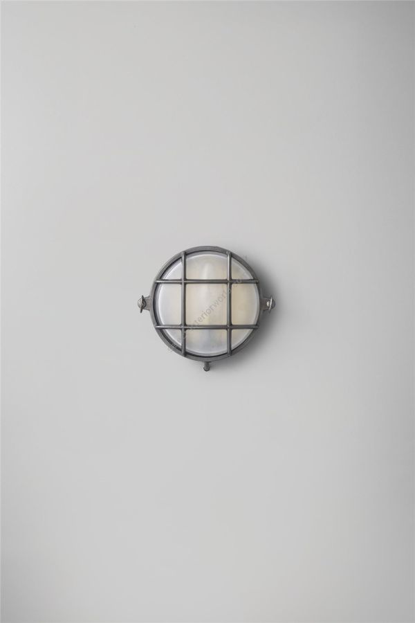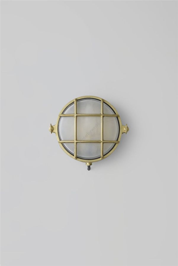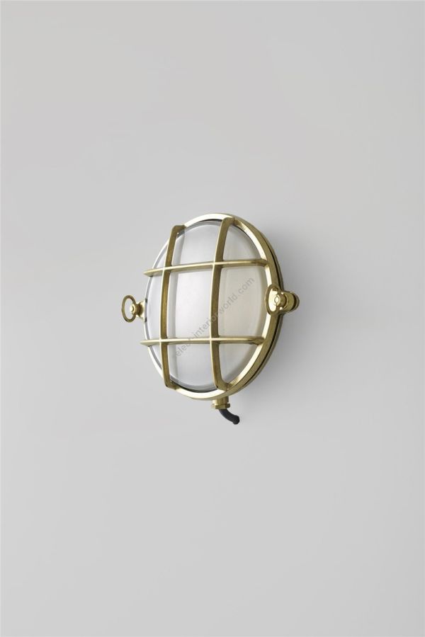 A small die-cast bulkhead light in natural brass (unlacquered) and with frosted glass diffuser. Also available in weathered brass and a chrome plated finish. Front guard secured by two wing nuts, dome nuts optional by request. Glanded surface cable entry.