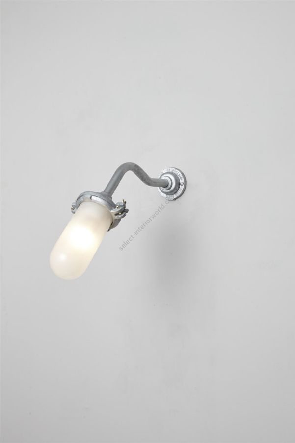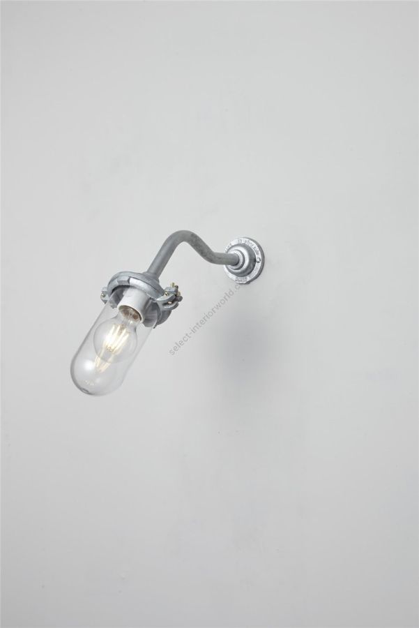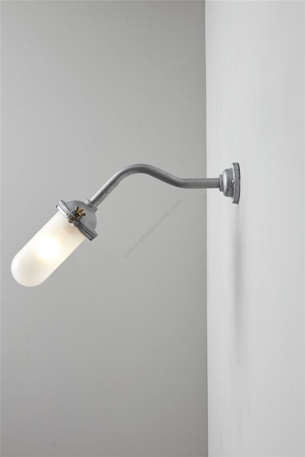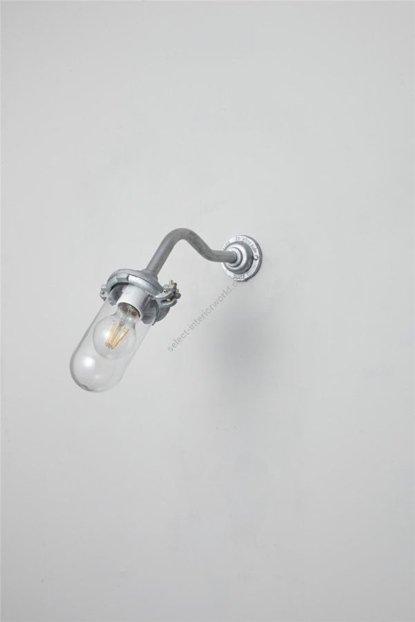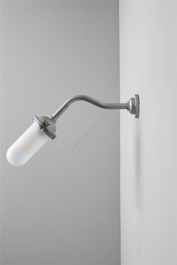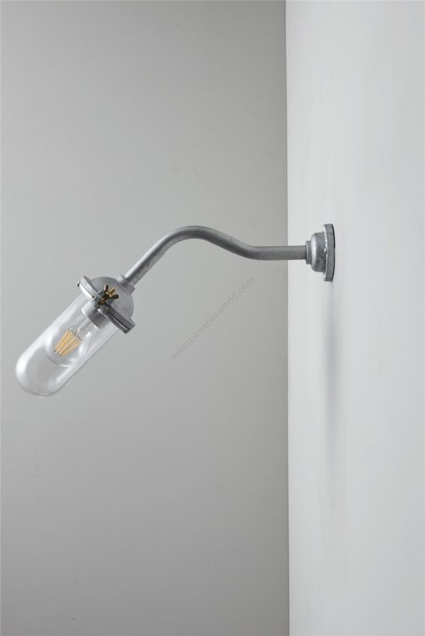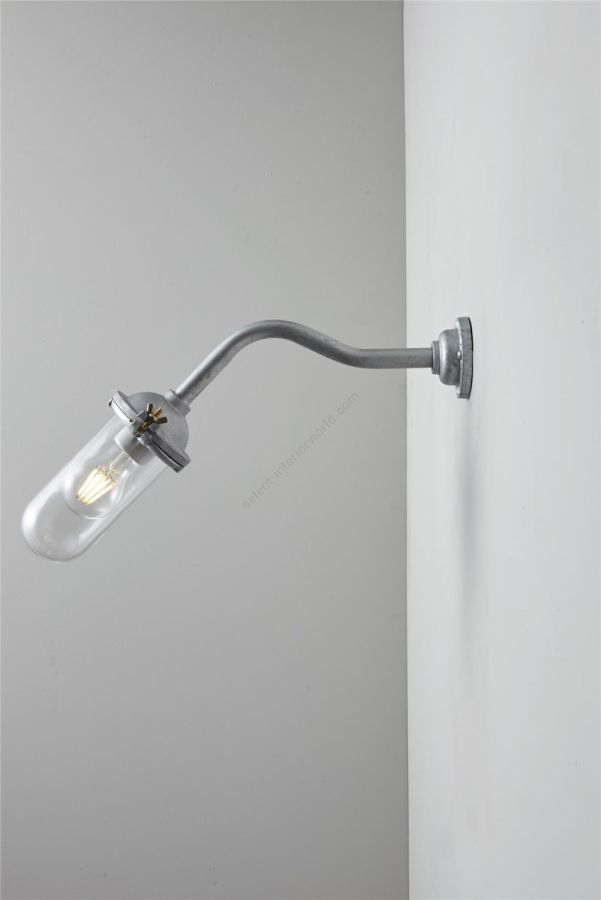 An Exterior Bracket Light with a simple ring that holds the clear or frosted glass fitting. This beautifully simple wall light is available in either galvanised cast iron or sandblasted bronze, and with a canted or right angle arm.