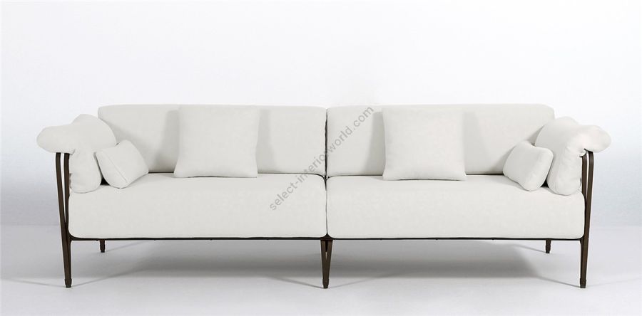 AISI 304 stainless steel forged sofa made with the tuscany craftsmanship savoir fair. Simple lines for this timeless collection of outdoor furniture to dress endless spaces, the Marina series is also available with indoor finishing, powder-coated for outdoor, with cushions in Sunbrella Nattè Col.Nature included.