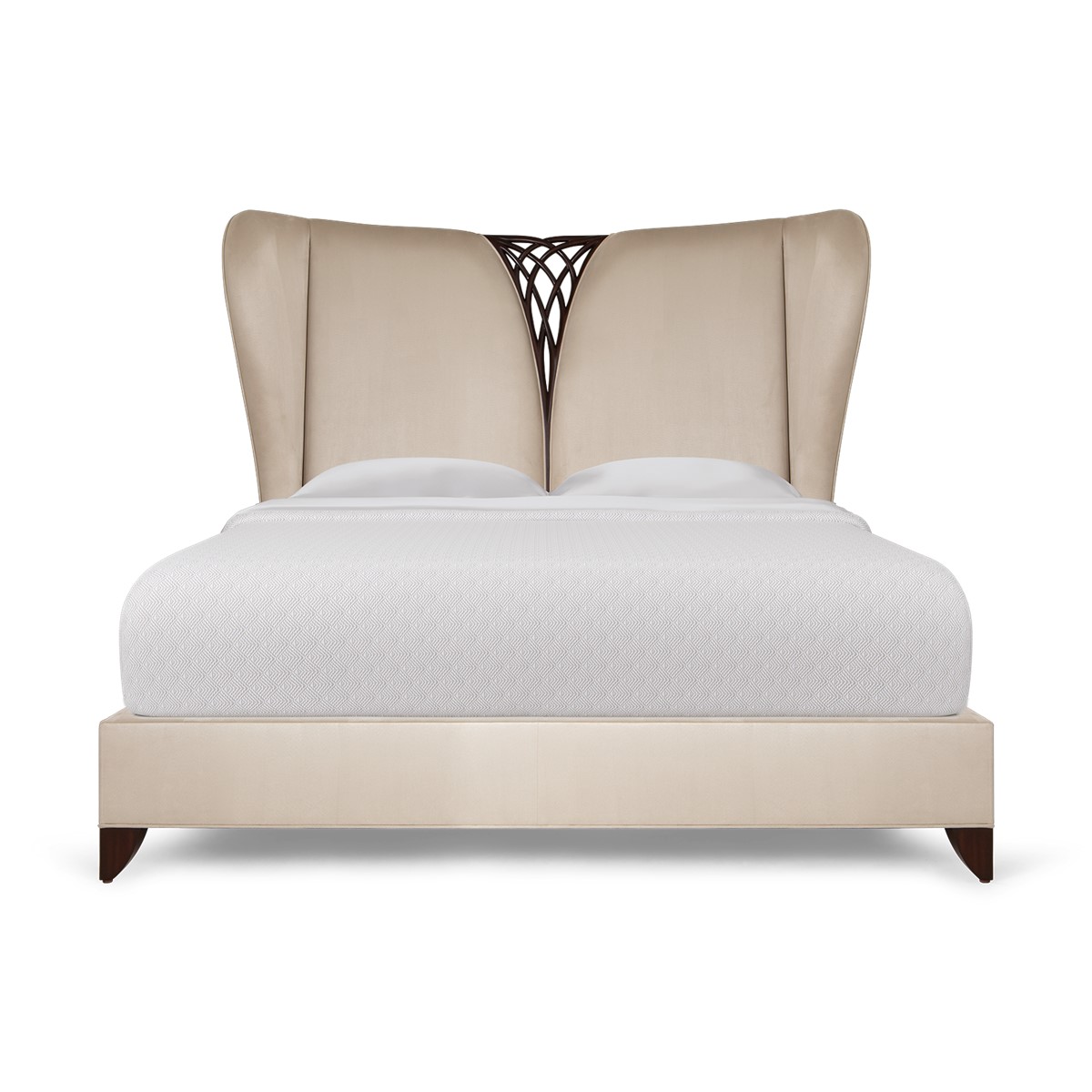 This magnificent bed features a delicately carved twine embedded as the centerpiece to the gently winged headboard. A true statement piece for any bedroom!