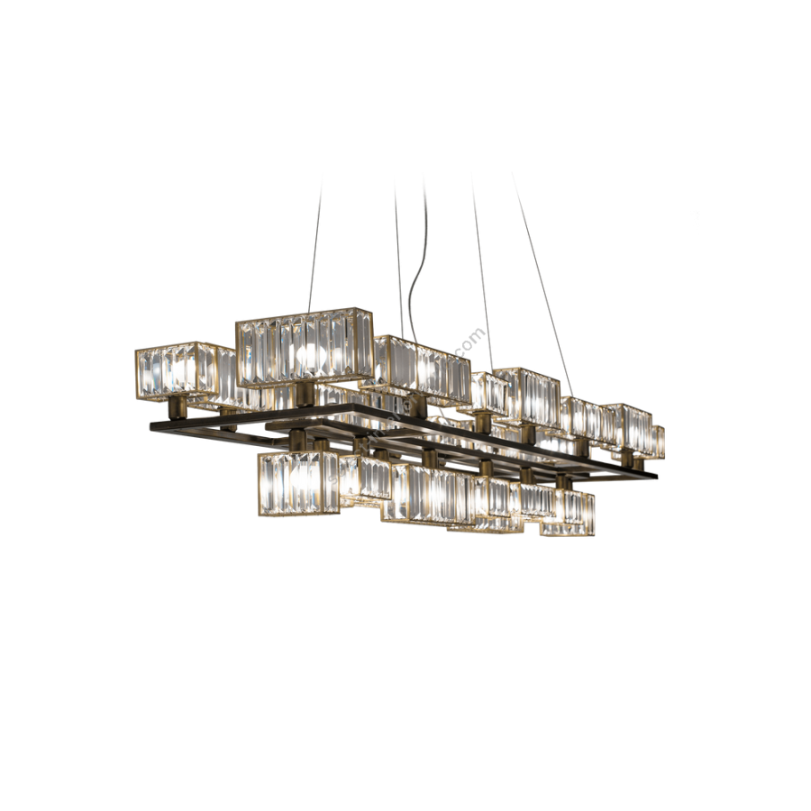 An ensemble of parallelepipeds of various heights made of transparent crystal lozenges, hand-assembled over a metallic chassis.
