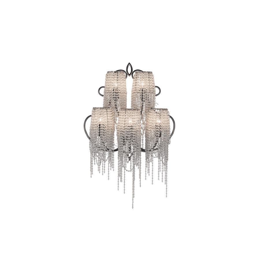 The strings of crystals are exclusively transparent and enriched by irregular elements of different shapes. A coup de theatre of great effect.