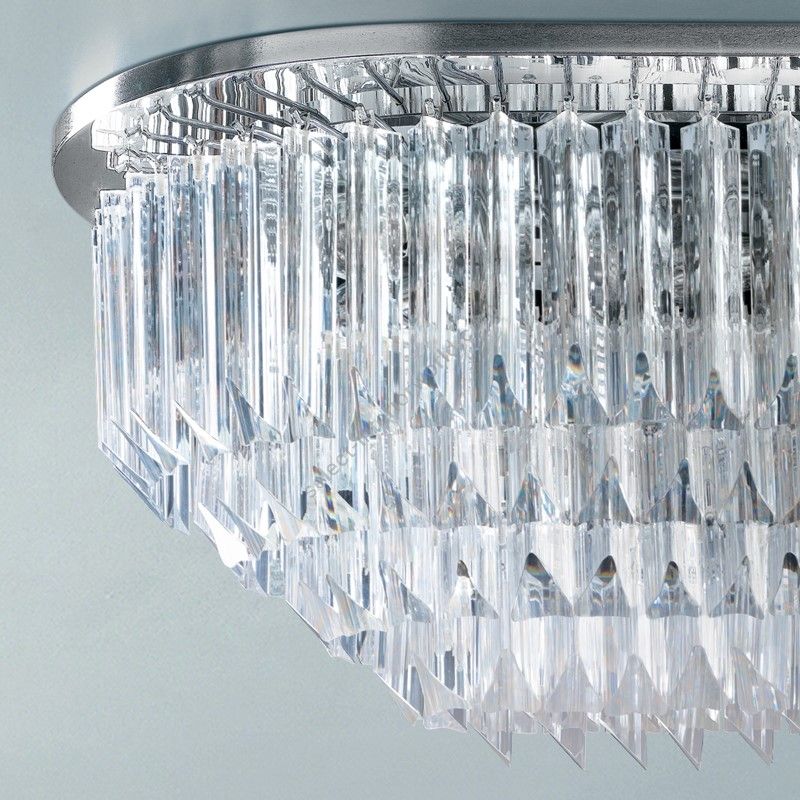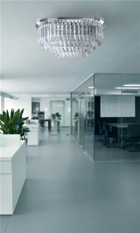 Ceiling lamp with crystal trihedrals or trihedrals and quadrihedrals in murano glass, available in many colours and a frame in 24 karat polished gold or chrome.