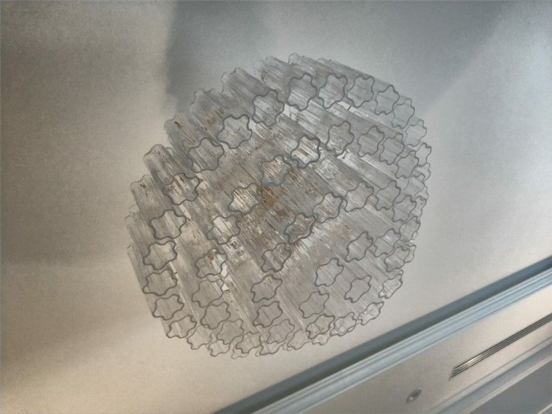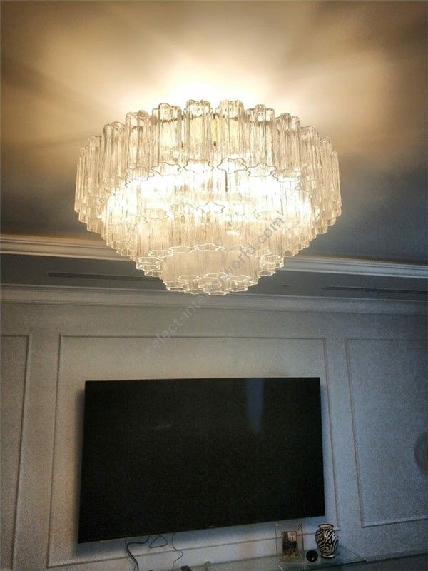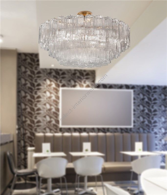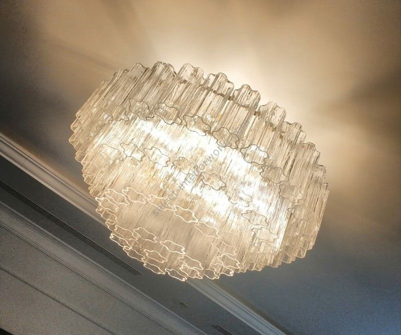 The decorative elements are tubes in hand-blown murano glass with an irregular section, available in the following finishes: clear, amber, smoked and pink.