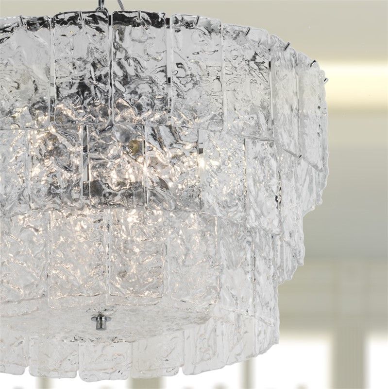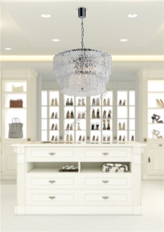 A design chandelier with a metal frame and handcrafted murano glass. 3 Colors available, chrome or 24 karat gold finish