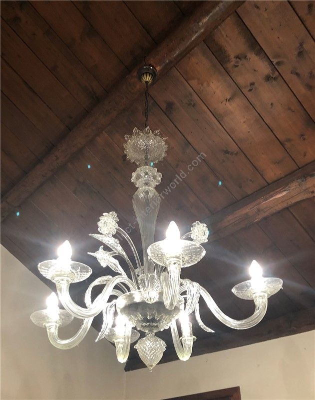 Chandelier with a vintage style, with wide arms, cups and pendants in hand-blown murano glass.