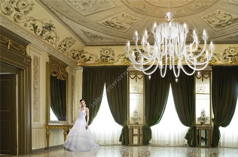 Handcrafted chandelier with wide arms in murano glass, fabric shade and led lighting.