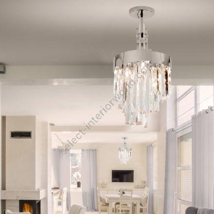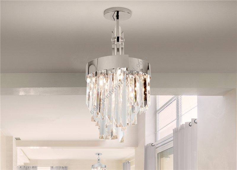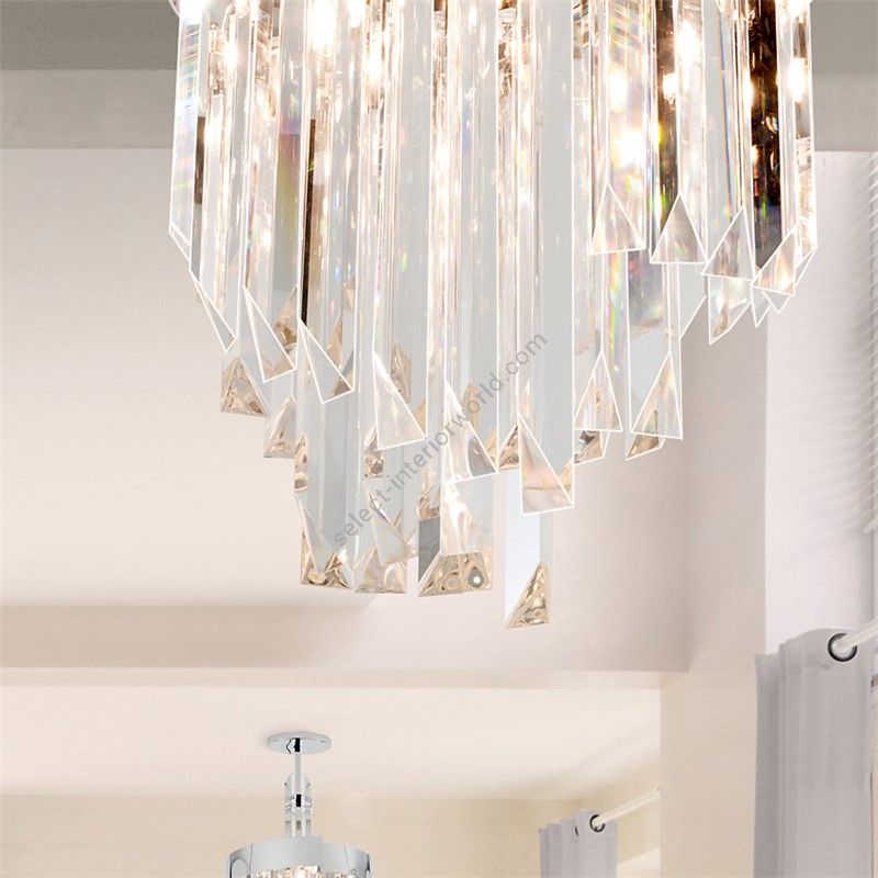 Luminous chandelier in clear crystal and aframe in polished chrome frame, dove grey or burnished brass. Elegant and refined chandelier, discover more