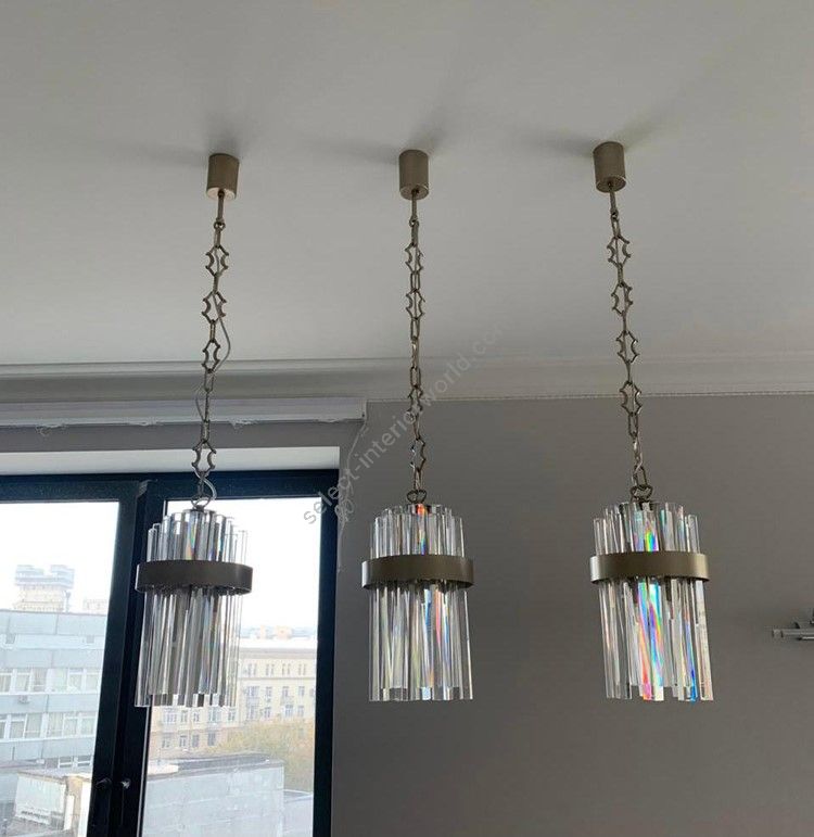 Luminous pendant lamp in clear crystal with a metal frame available in burnished brass, dove grey and brushed grey.