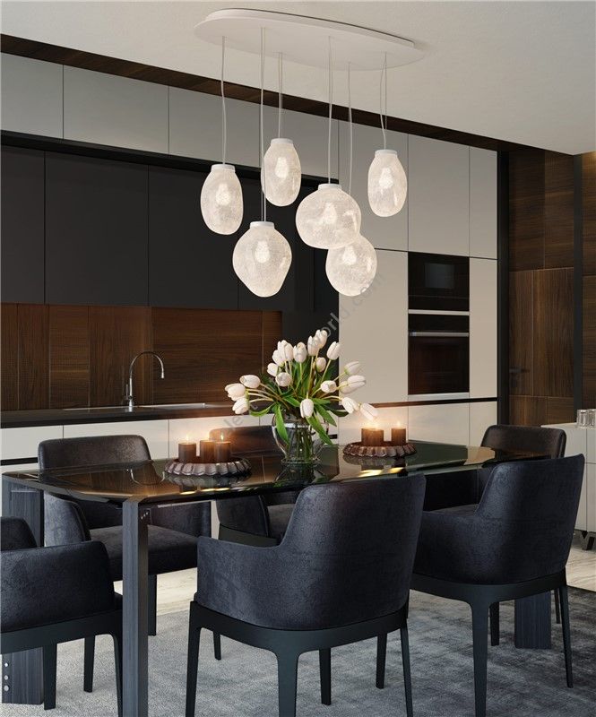 Suspension lamp with a refined and contemporary design that perfectly adapt to the following home environments: kitchen, living room, lounge and bedroom available with handblown murano glass with alabaster finish