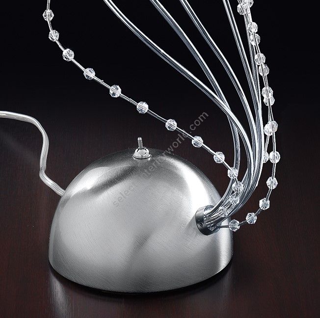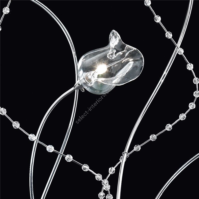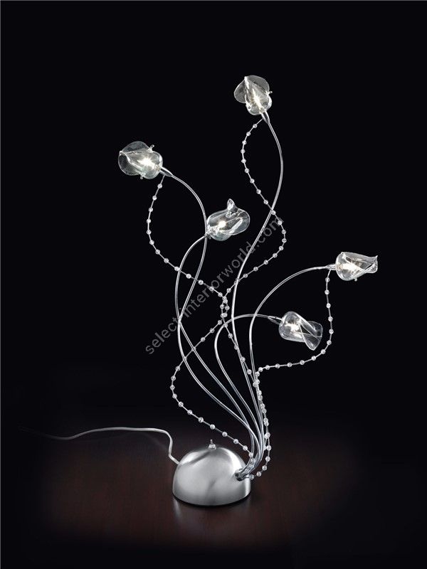 Table lamp with a modern design, composed by multi-faceted clear crystal chains and hand-blown glass flowers covering light bulbs.