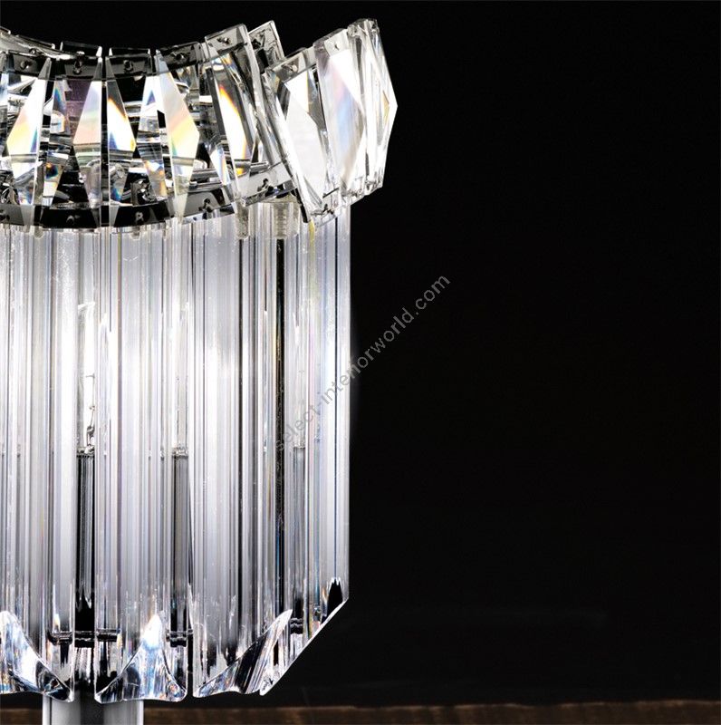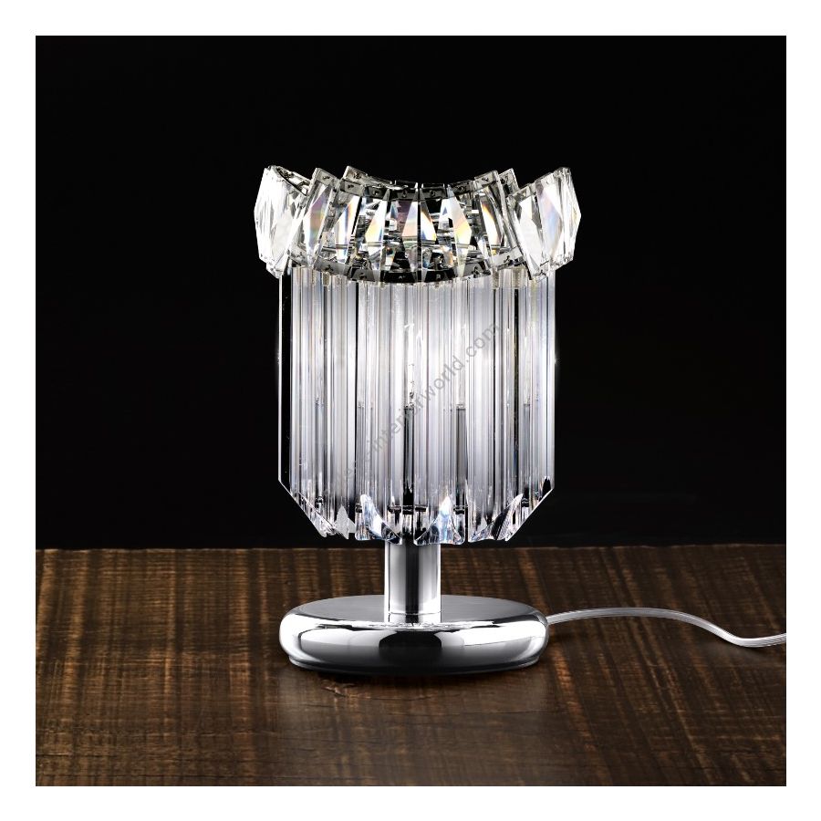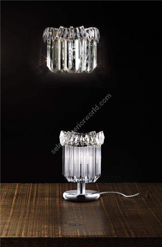 Table lamp with crystal trihedrals or trihedrals and quadrihedrals in murano glass, available in many colours and a frame in 24 karat polished gold or chrome.
