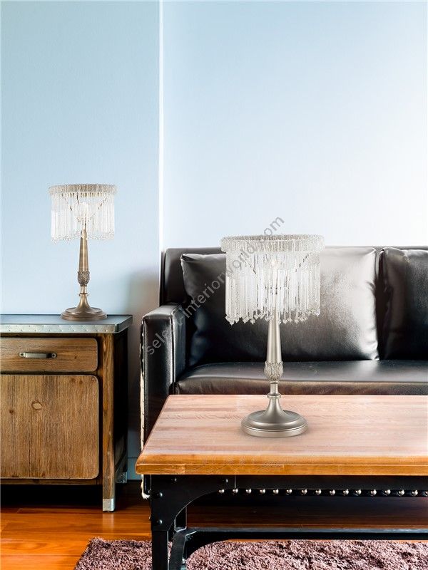 Table lamp with a handcrafted fringe formed by murano glass clear or amber beads and a frame in bronze, dove grey or grey.