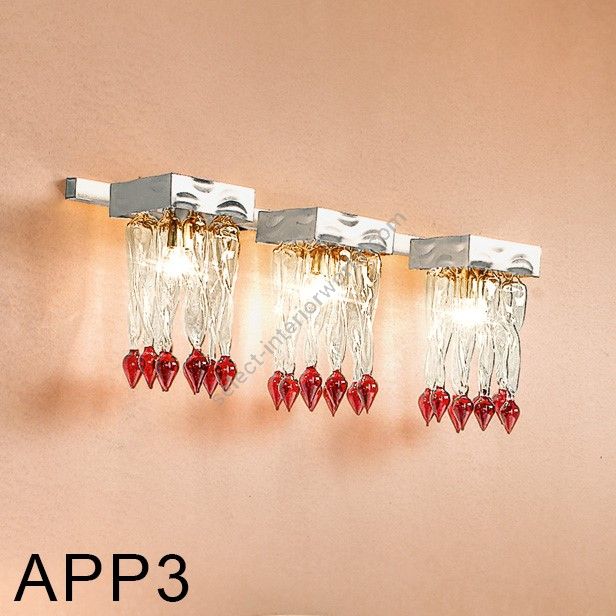 Wall lamp with decorative elements in colourful murano glass and a frame in gold or silver leaf.