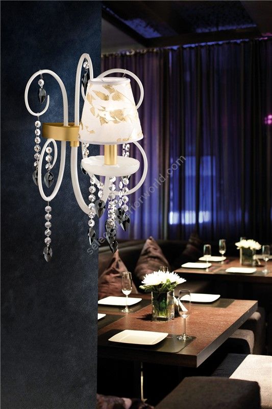 Wall light in hand-blown Murano glass with glass croziers and multifaceted crystal pendants. Wall light with lampshade available with different finishes, colours and types of fabric.