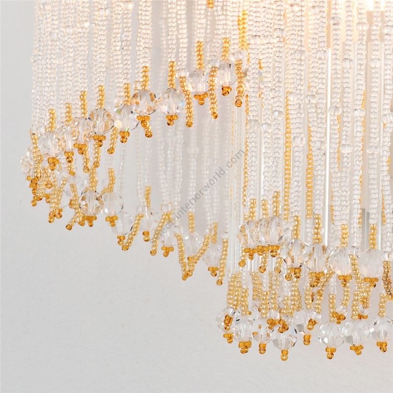 Decorative fringe formed by tiny beads made of murano glass, ultra-pure crystal rods and crystal pearls, all assembled and sewn by hand according to the venetian tradition.