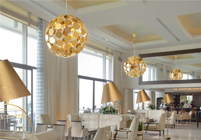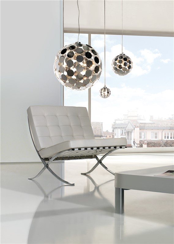 Suspension lamp with dozens of small metal discs welded together in 24 karat polished gold or chrome.