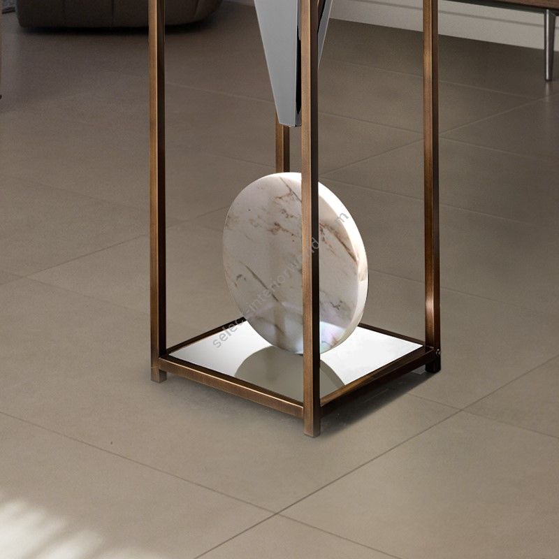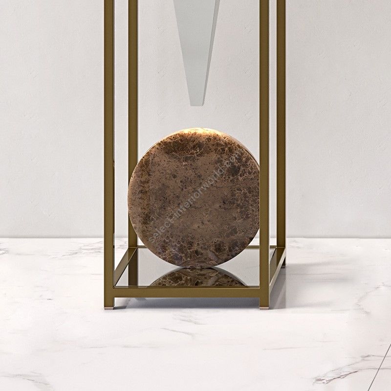 The metal frame, which is very minimal and discreet to emphasise the glass at its best, is refined shiny-mirror finish, the bearing structure is refined in burnished brass, dove gray or iron gray.