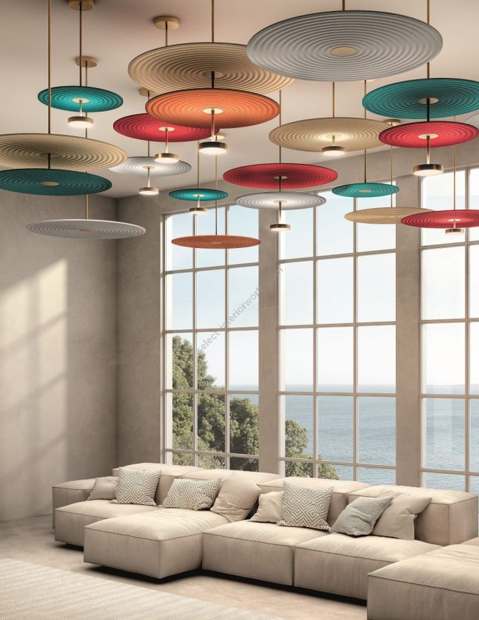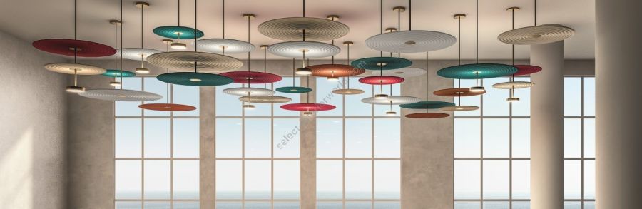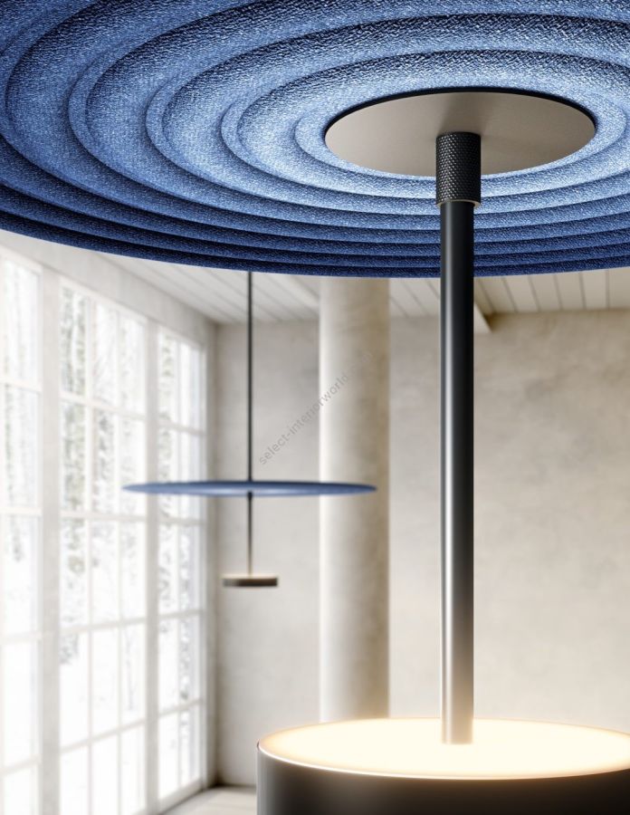 Modular suspension with metal structure in three sizes, available in gold and black matt finishes. Sound-absorbing fabric discs are available in three diameters in the following colors: bordeaux, dark blue, petroleum, brick, sand, light grey, dark green.