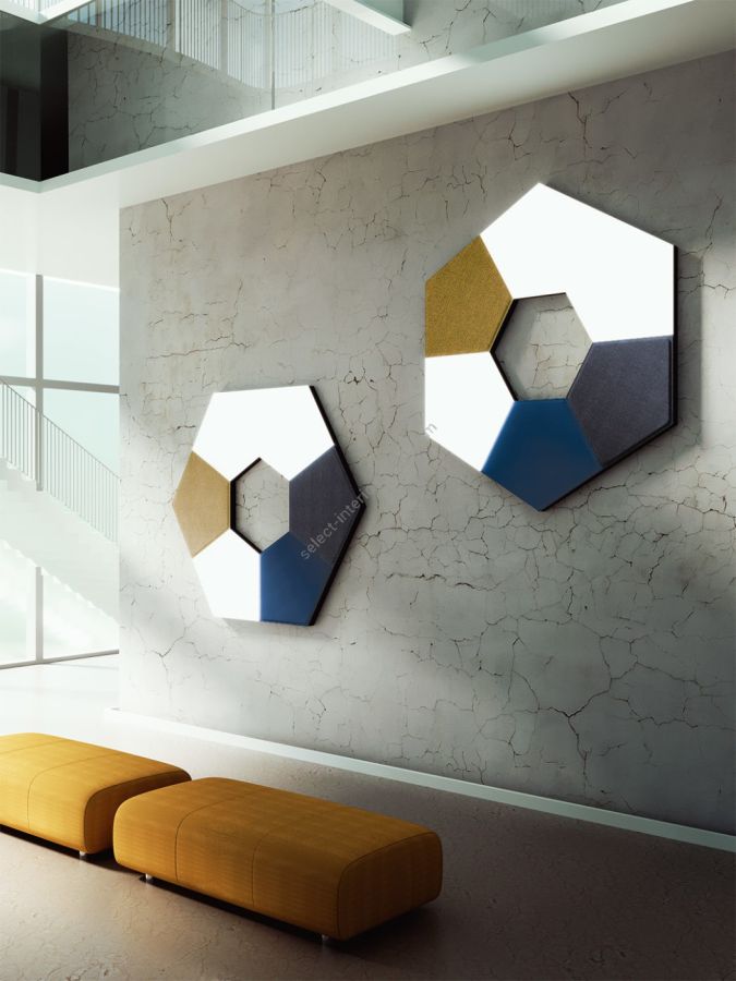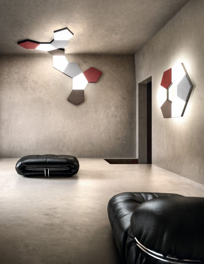 PMMA diffuser from opal white. Painted aluminum structure. Sound absorbing panel in PET fiber covered in coloured fabric. Possibility of combining the single module in different compositions.