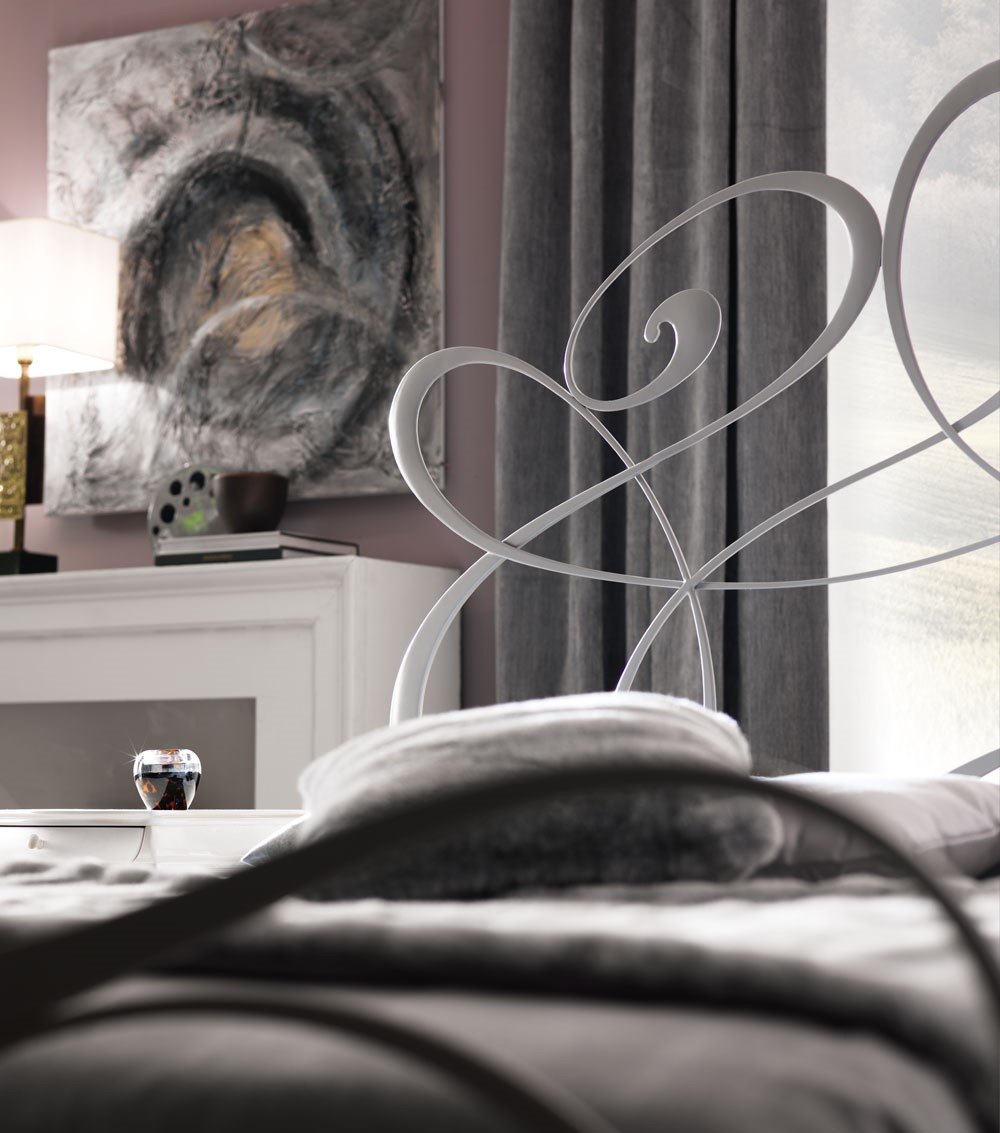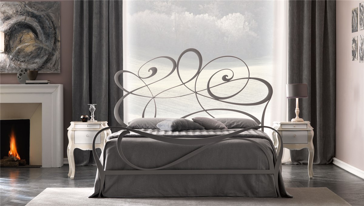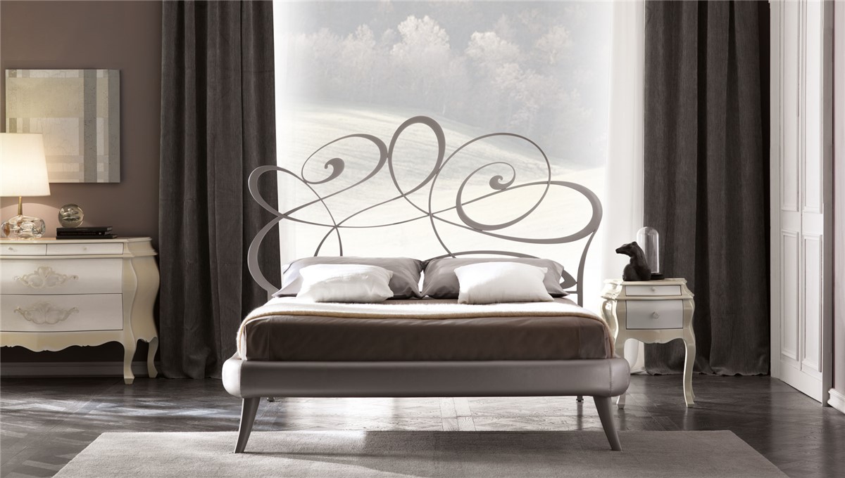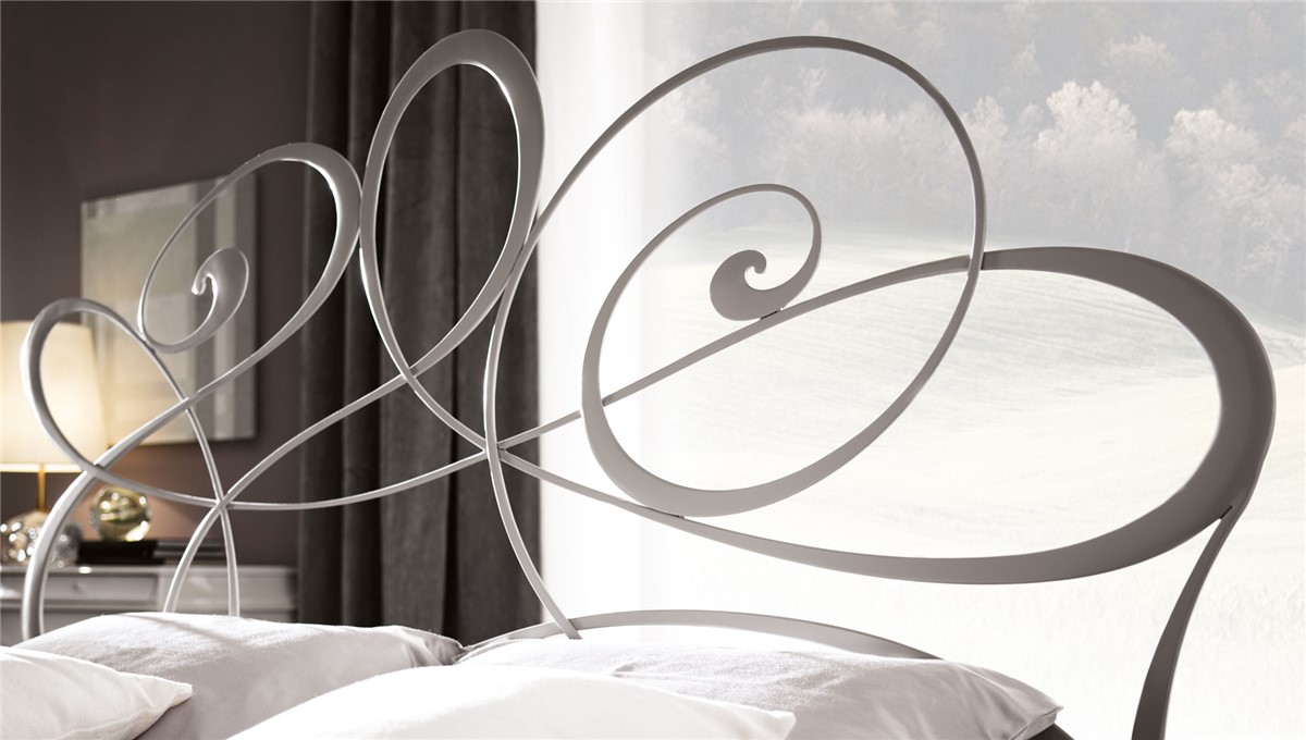 A young and romantci bed with bedhead and bedfoot realized in hand-polished laser cutted iron.Twists and curves, aknowledged symbol of the Brand lift up on the centre of the bedhead to create a focus on the manufacturing. Available also without bedfoot and with upholstered bedrail and decorated wooden legs
