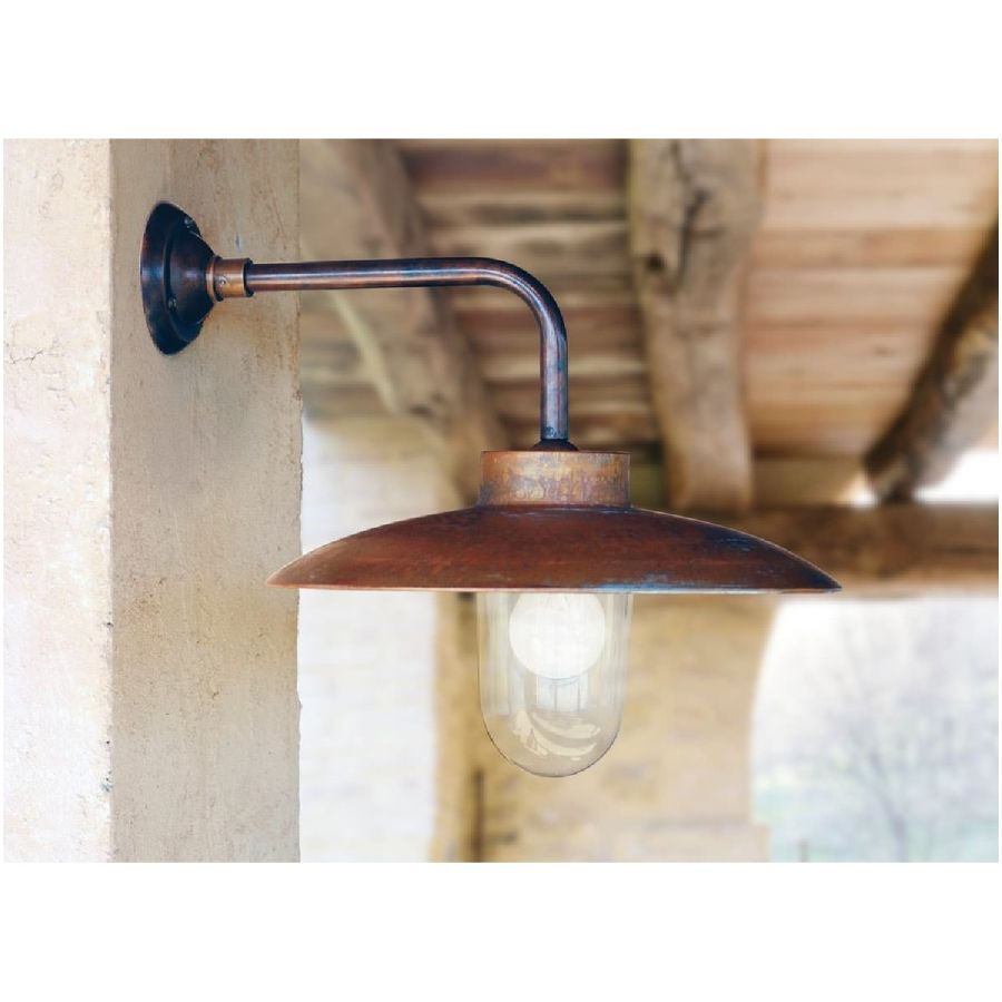 Seria zewnętrznych lamp montowanych naściennie z postarzałym miedzianym reflektorem, hartowanym przezroczystym szkłem i postarzałym mosiężnym uchwytem.
